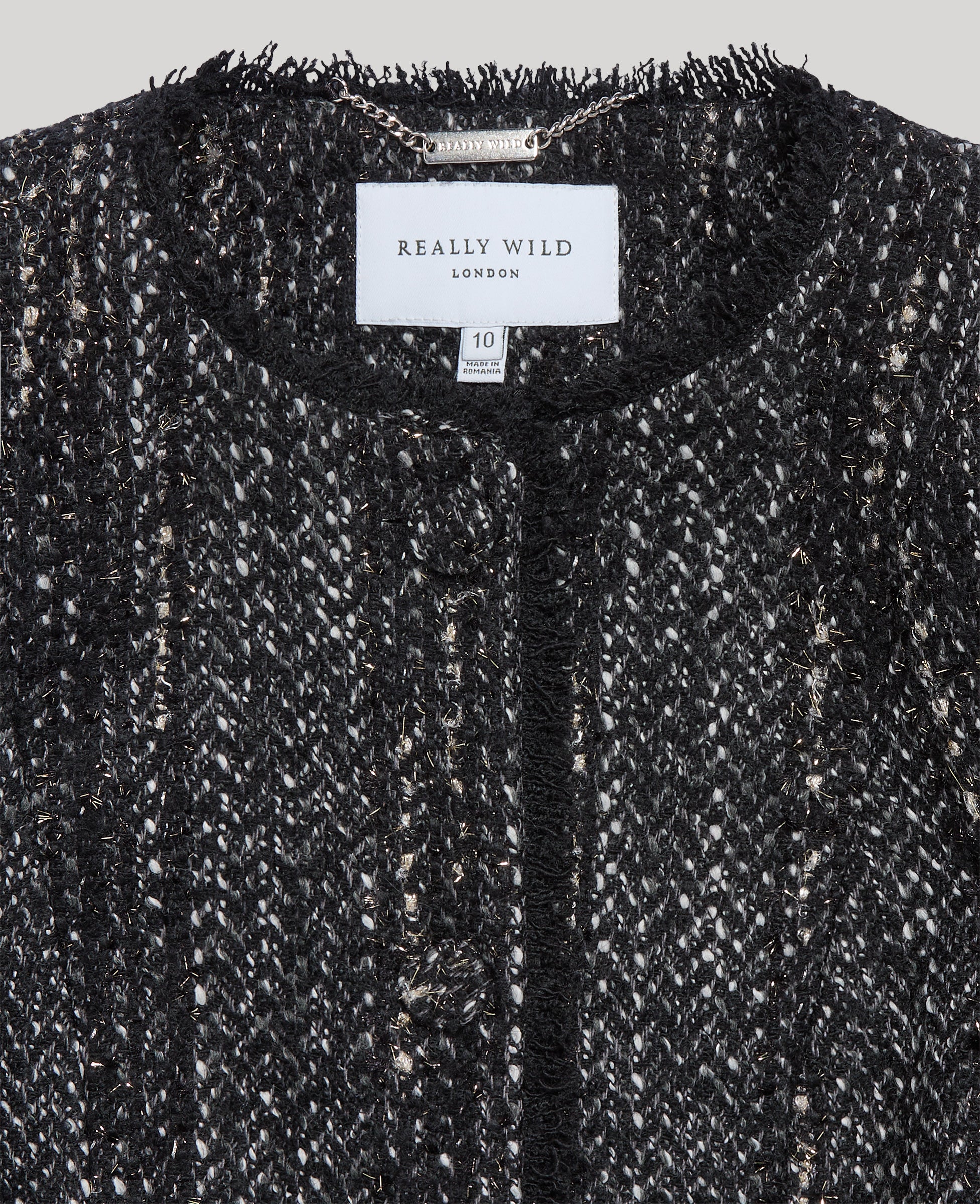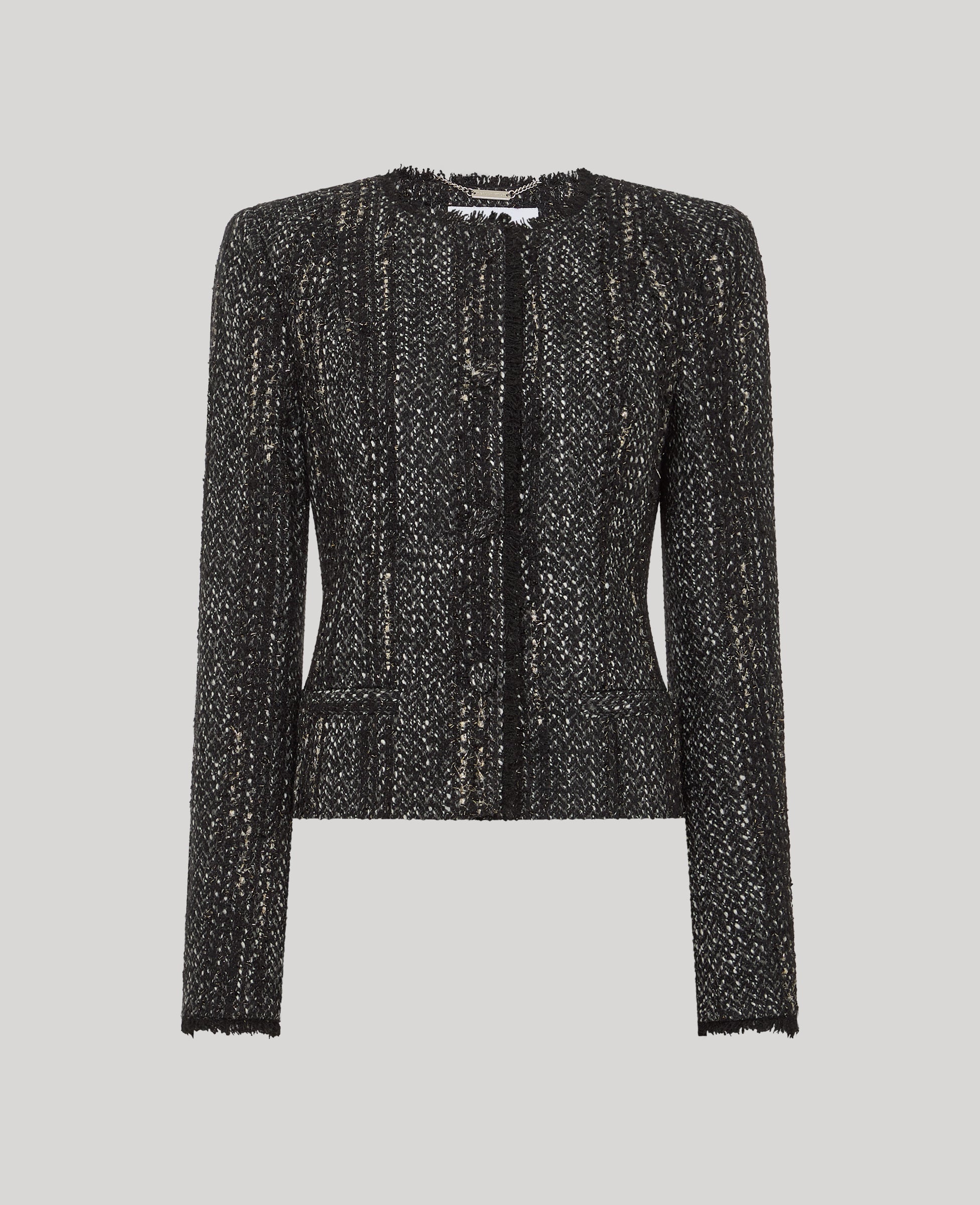 The Audrey Bouclé cropped jacket, crafted from luxurious subtle black glitter bouclé fabric, this piece offers a perfect blend of elegance and refinement. The jacket’s simple, tailored cut enhances the feminine silhouette, complemented by subtle pocket detailing and a refined back neck chain. The subtle glitter woven through the fabric makes it perfect for smart day or evening wear teamed with our Somerset shift dress or 100% silk Cadogan tie neck blouse and black Blaire skirt.