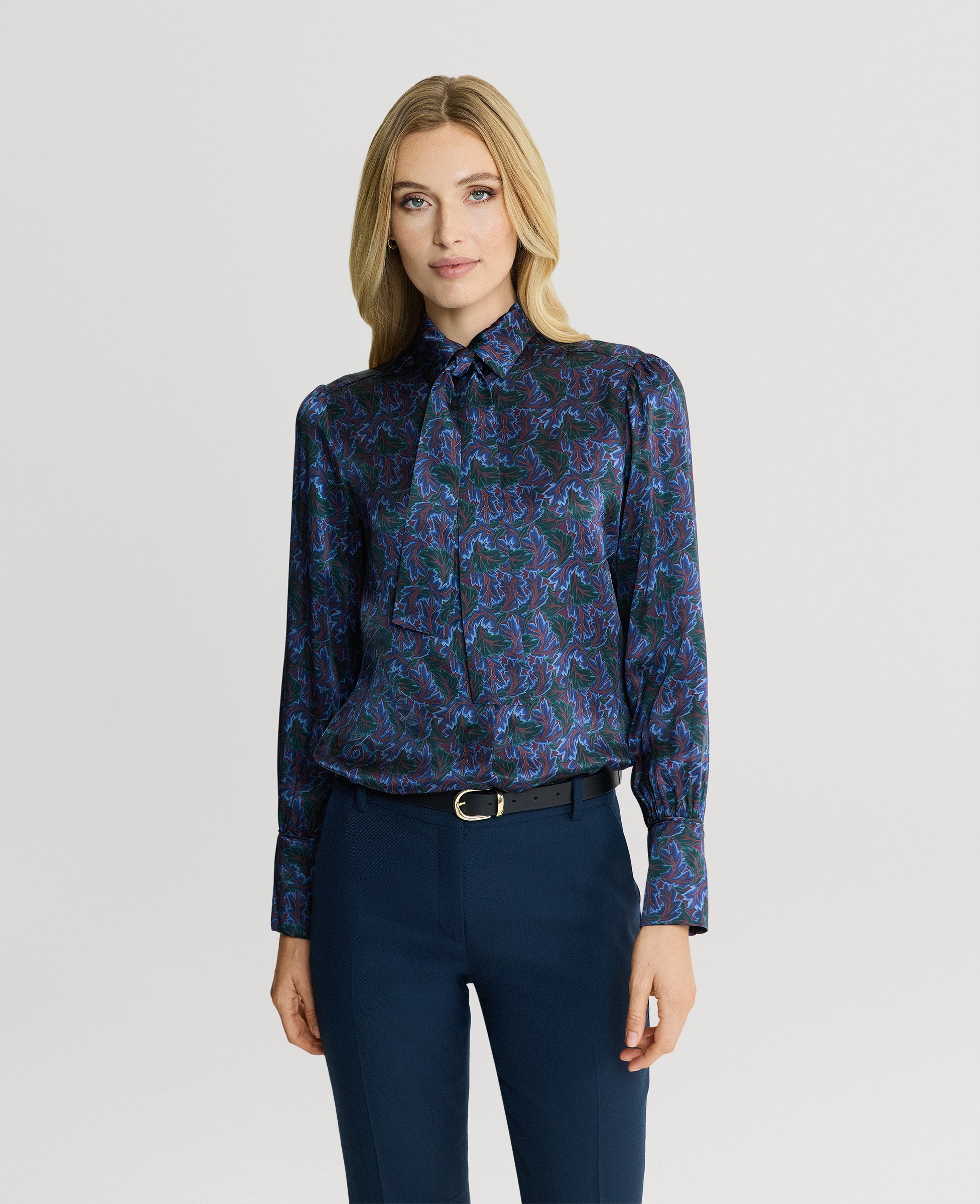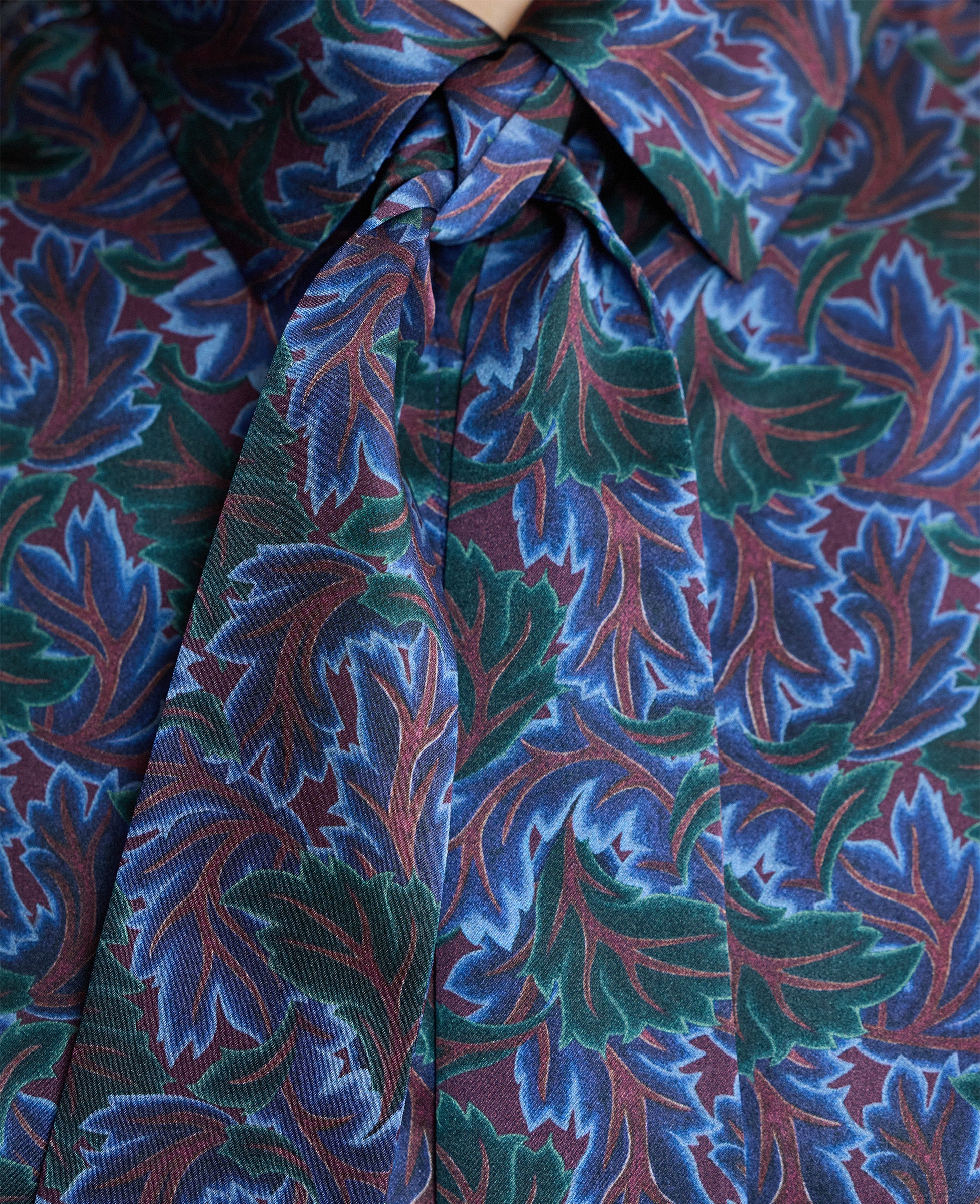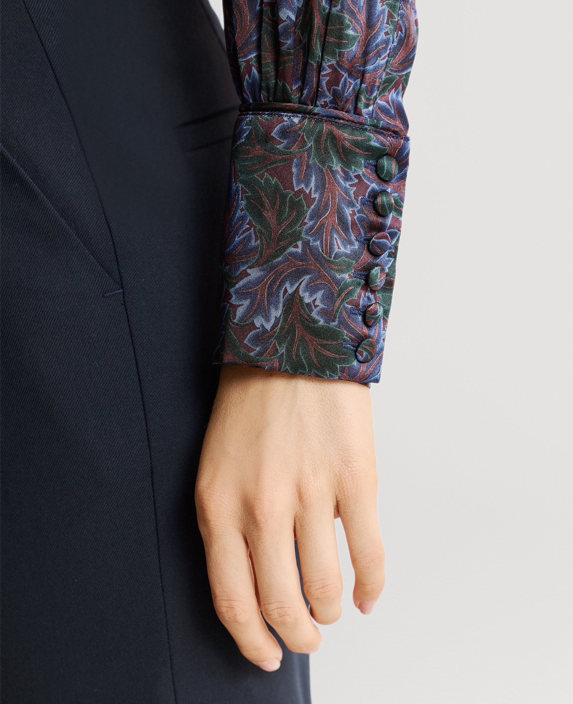Made from 100% silk from the Liberty archive, our Birch Blouse is designed in a classic birch leaf print and elevated with a rich colour-way of deep blue, oxblood and forest green. Style as a classic shirt during the day or elevate with the detachable tie which offers multiple ways to style at the neck.