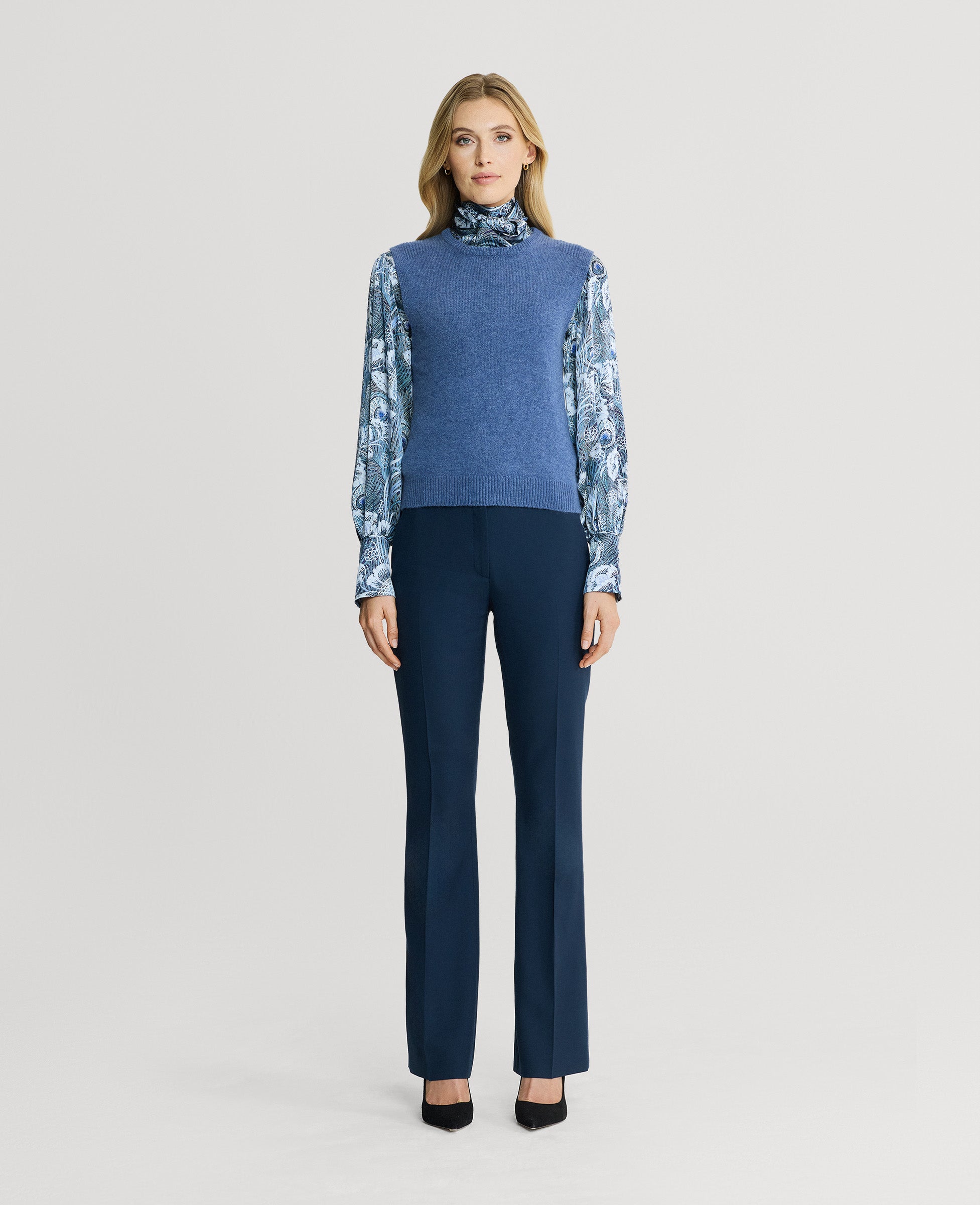 Made in London from 100% recycled cashmere, our Highgrove Tank in denim is designed for everyday wear and is a wardrobe staple for the autumn/winter months. The denim-tone yarn pairs effortlessly with our 100% silk, plain blue and peacock print blouses, designed to align seamlessly and strike a balance between smart and casual. This classic knit is equally at ease styled with more relaxed casual shirts.