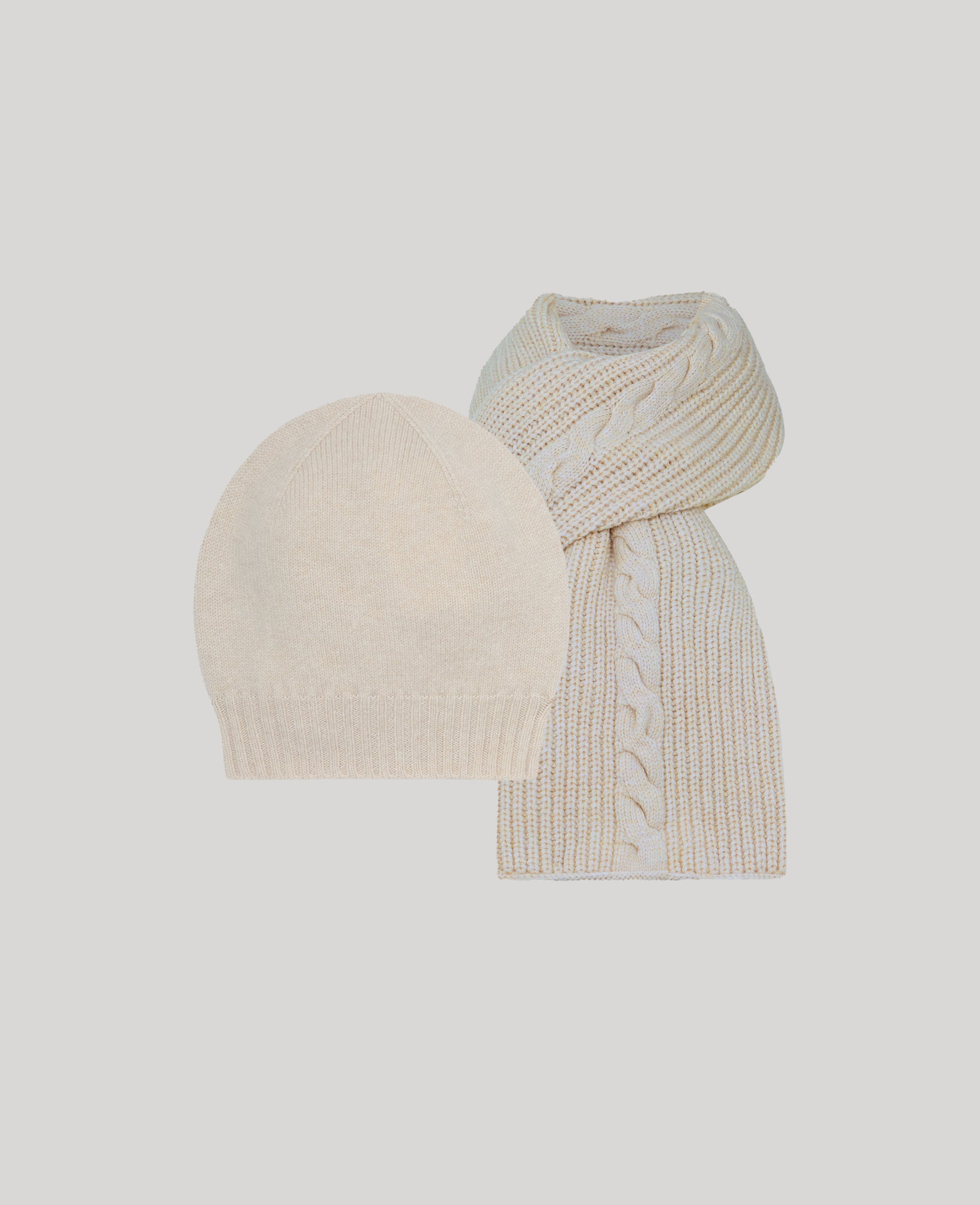 Our simple yet elegant cashmere beanie and scarf set brings effortless warmth and sophistication to winter days. This matching set features a cozy beanie and scarf in classic swansdown ivory, providing a timeless, coordinated look.