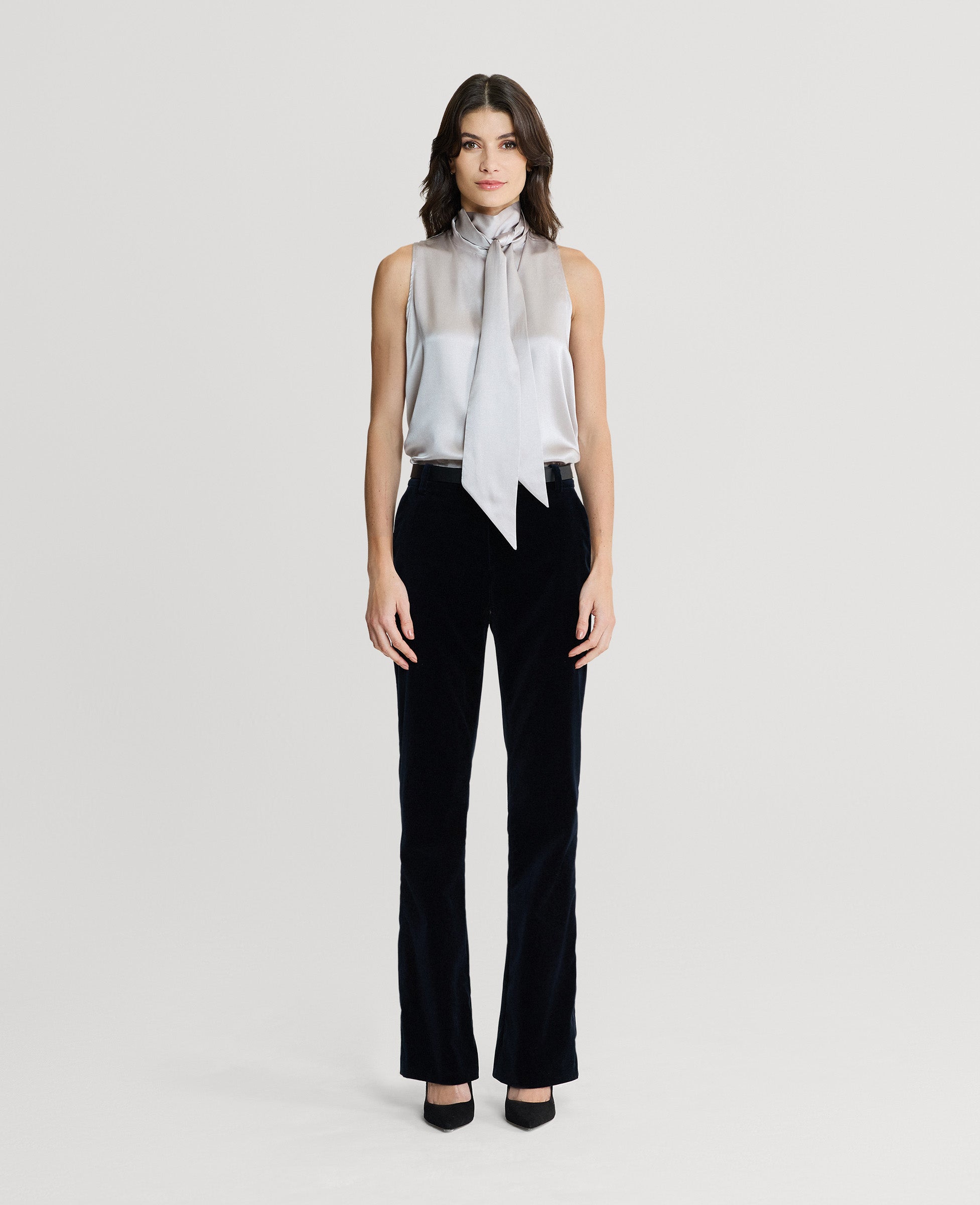 Model wearing Velvet Trousers in Midnight Navy Blue with silk blouse and heels