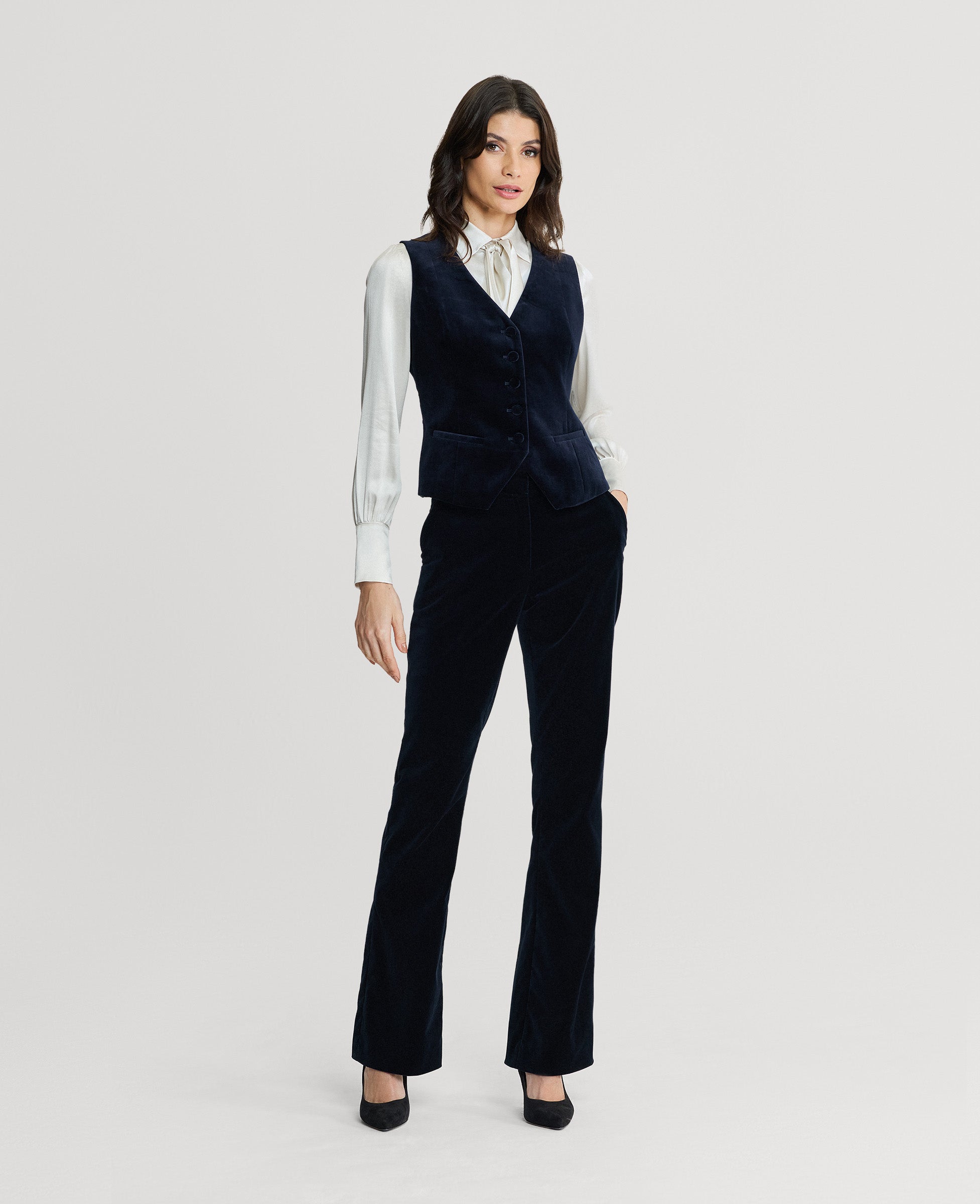 Model wearing Velvet Trousers in Midnight Navy Blue with silk blouse and velvet waistcoat and heels