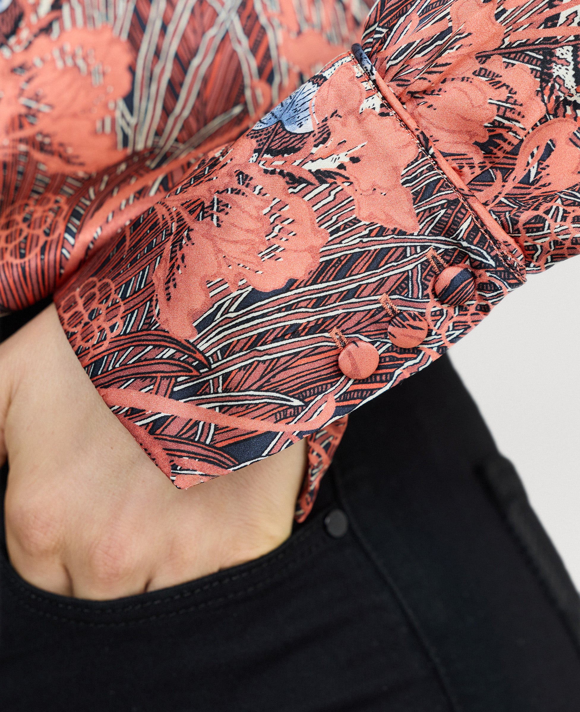 Made from 100% silk in archive Liberty print, our striking Peacock Shirt in coral evokes a sense of heritage and distinction. They elegantly frame the shoulders, while the fluid silk drape makes it easy to style. Wear alone or as layering pieces throughout the season.