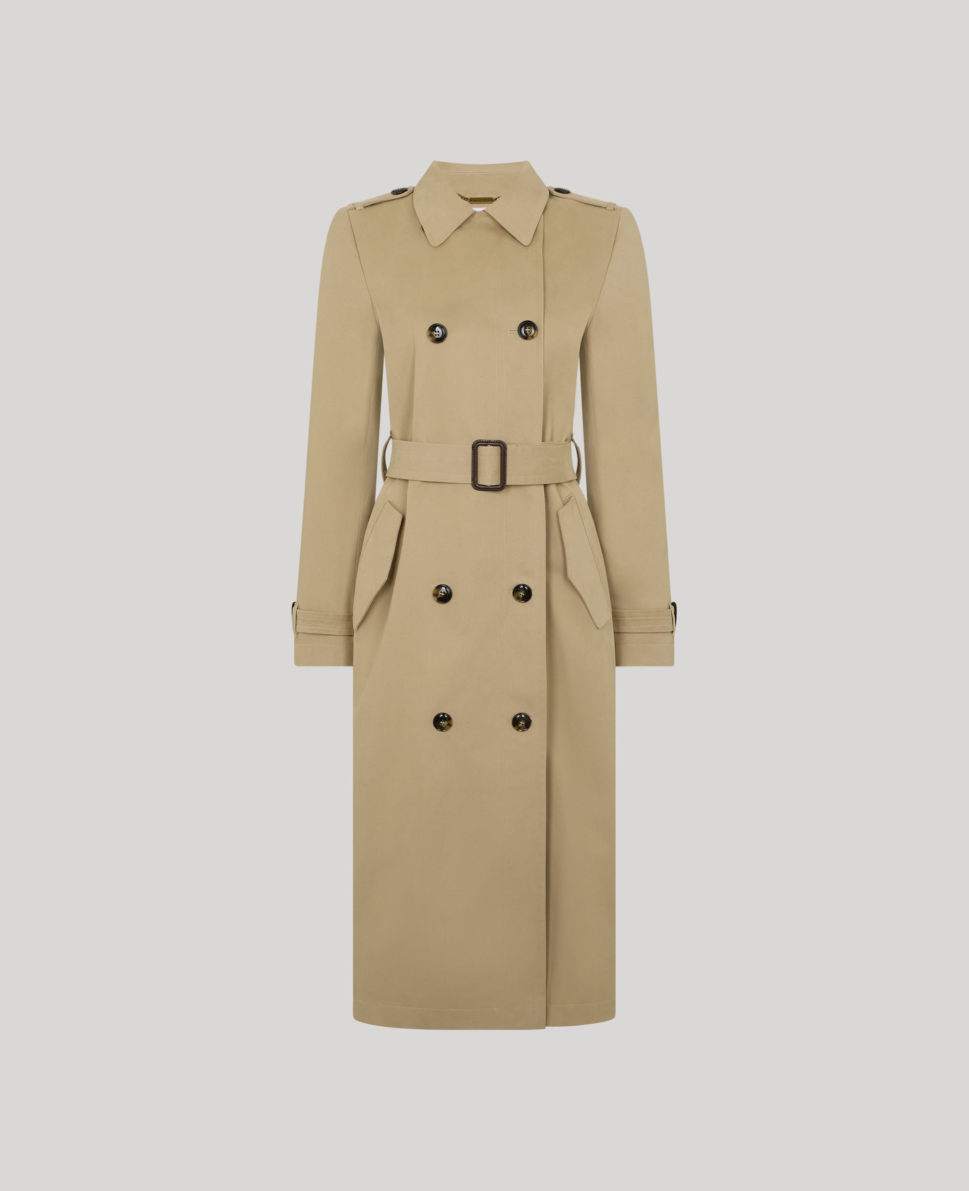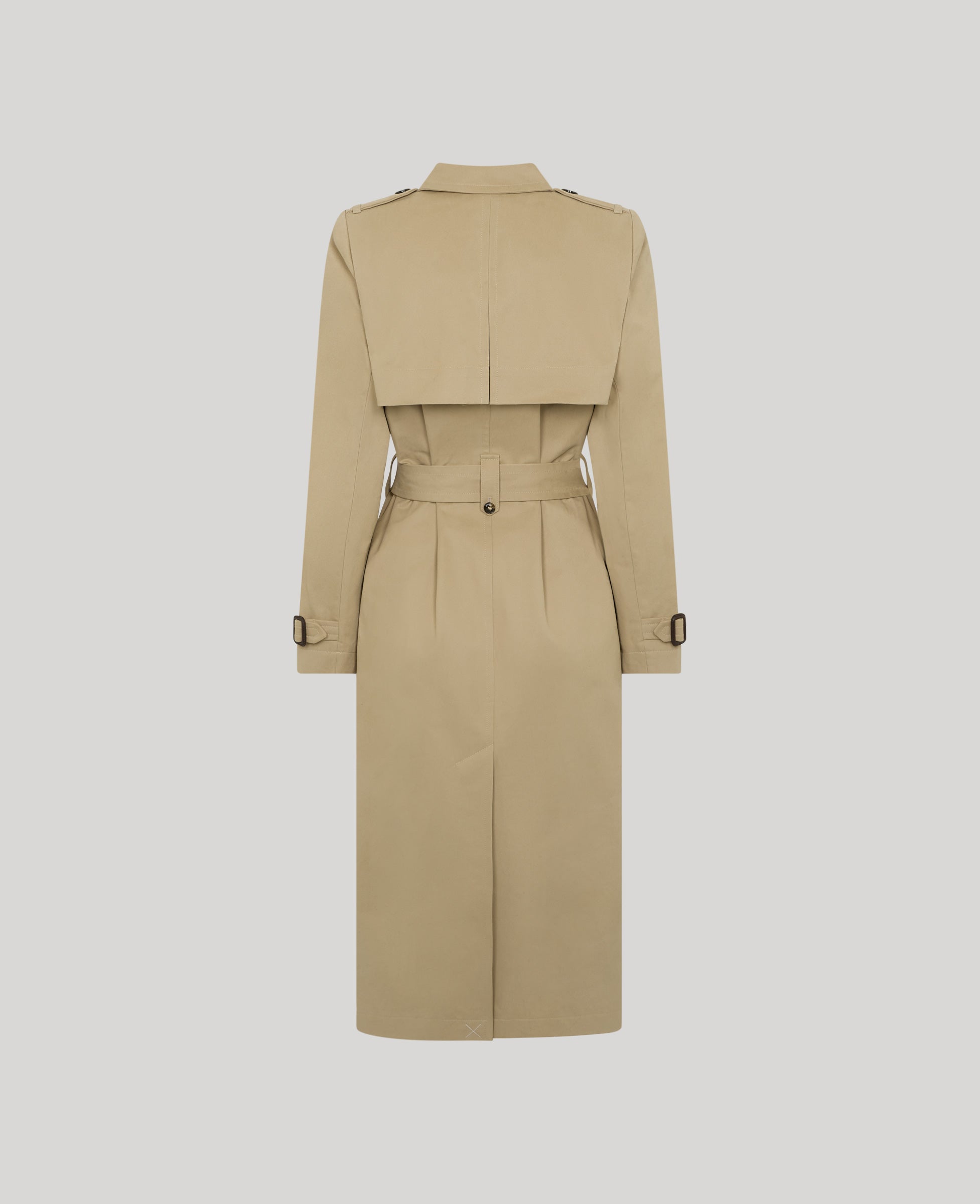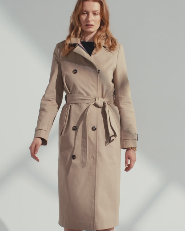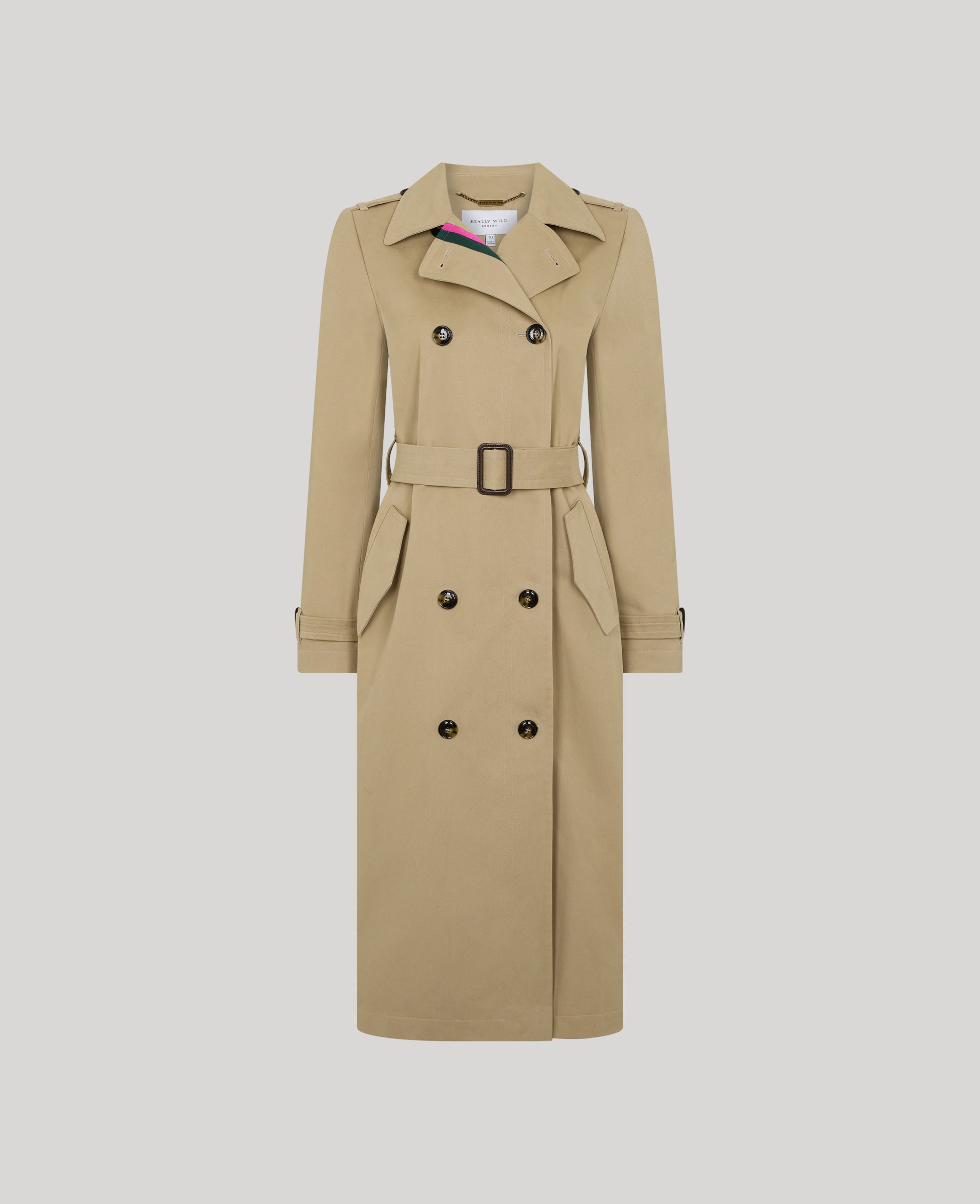 The Spring Trench Coat in Stone perfectly pairs slick modern tailoring with iconic heritage design. This British wardrobe classic features intricate elevated detailing including a chocolate embossed leather collar and inside contrasting grosgrain ribbon. The heavy cotton drill outer has a premium peach like finish and this is combined with a gorgeous hand stitched green satin lining.
