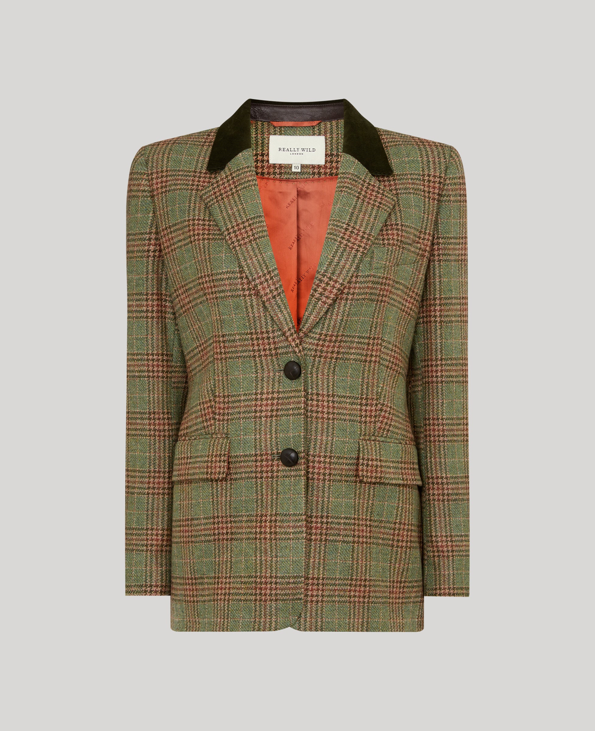 Made from virgin wool and cashmere, our Wellington jacket is single-breasted with leather covered buttons and finished with dart detailing to flatter the feminine shape. Designed in green and rust check inspired by the autumnal colour palette, this is a soft and luxurious outerwear piece.