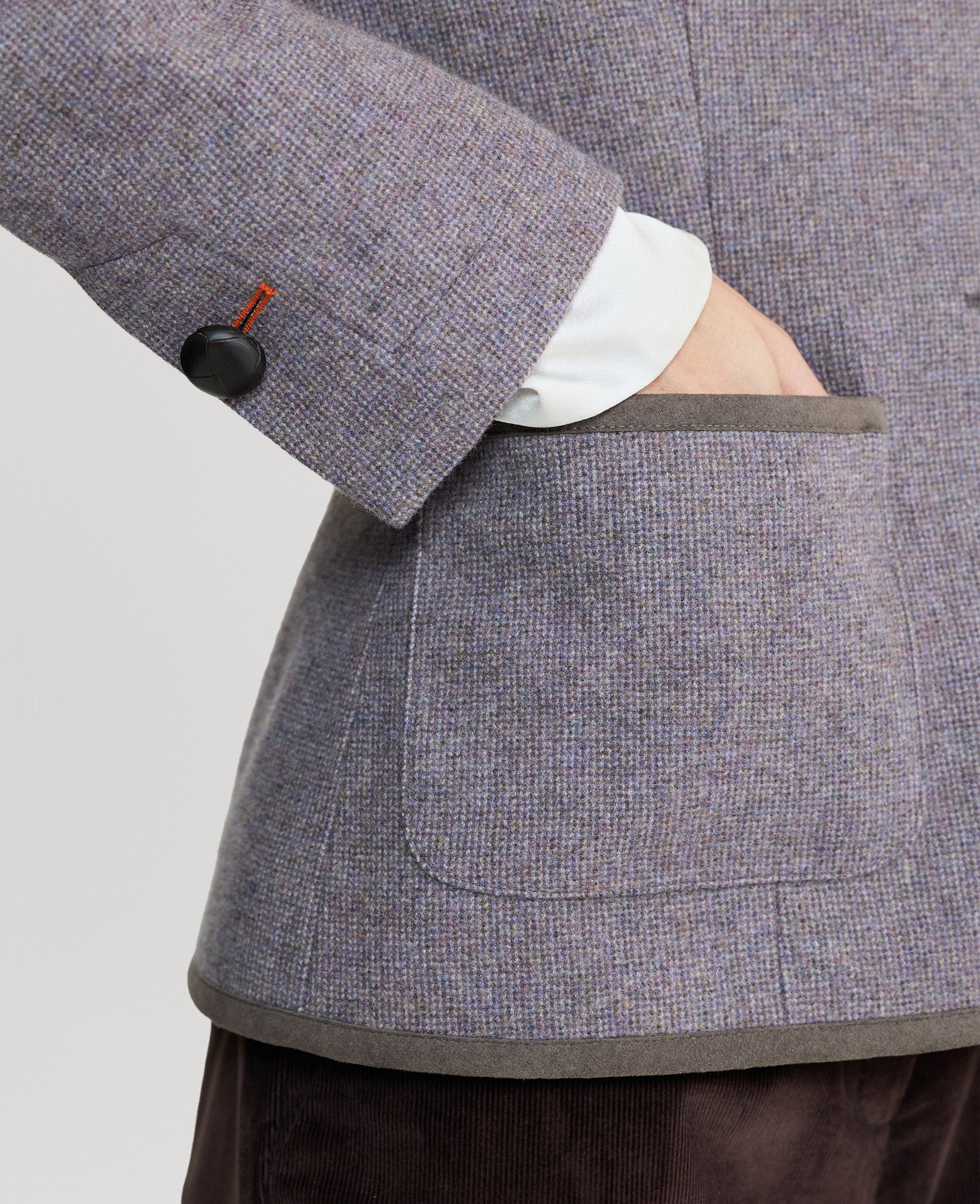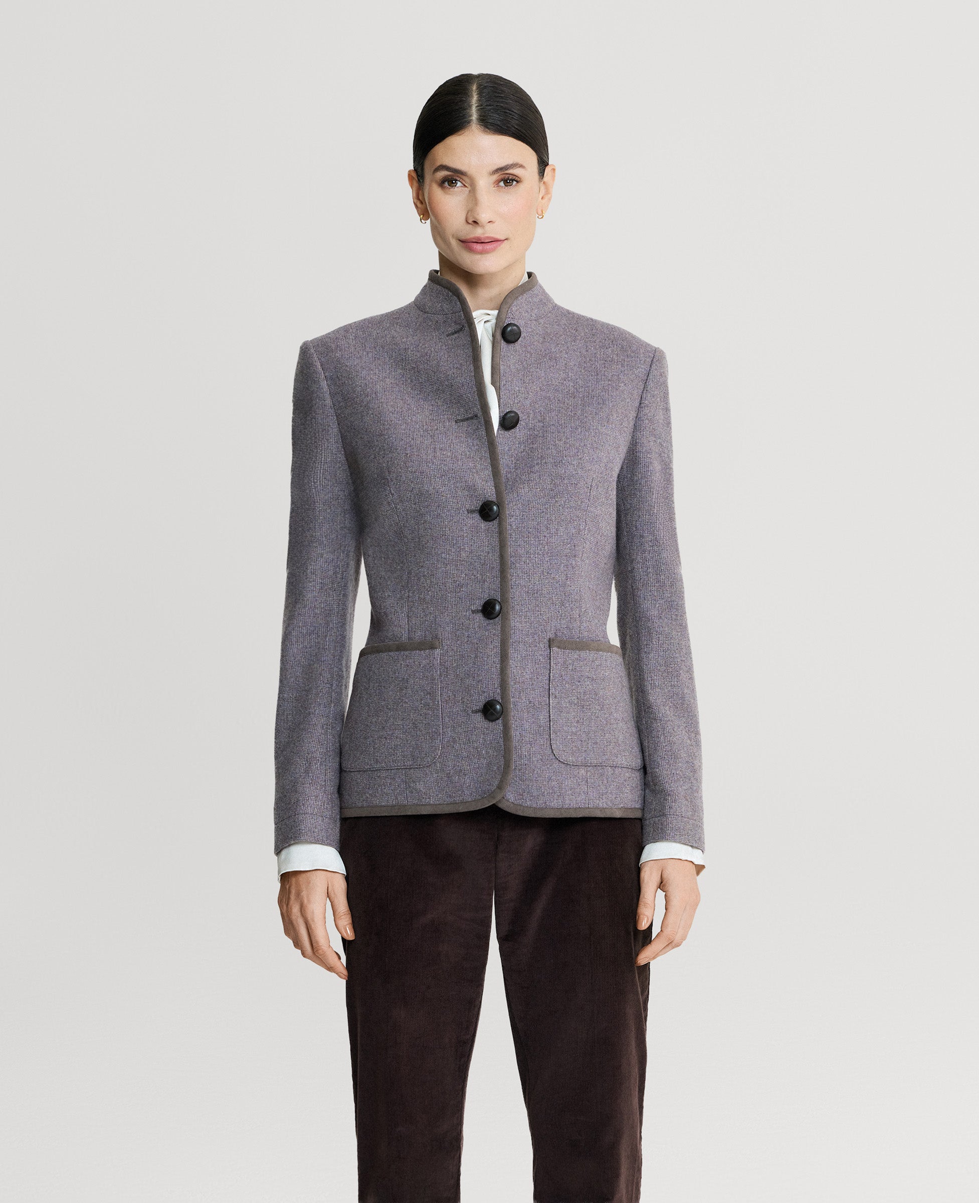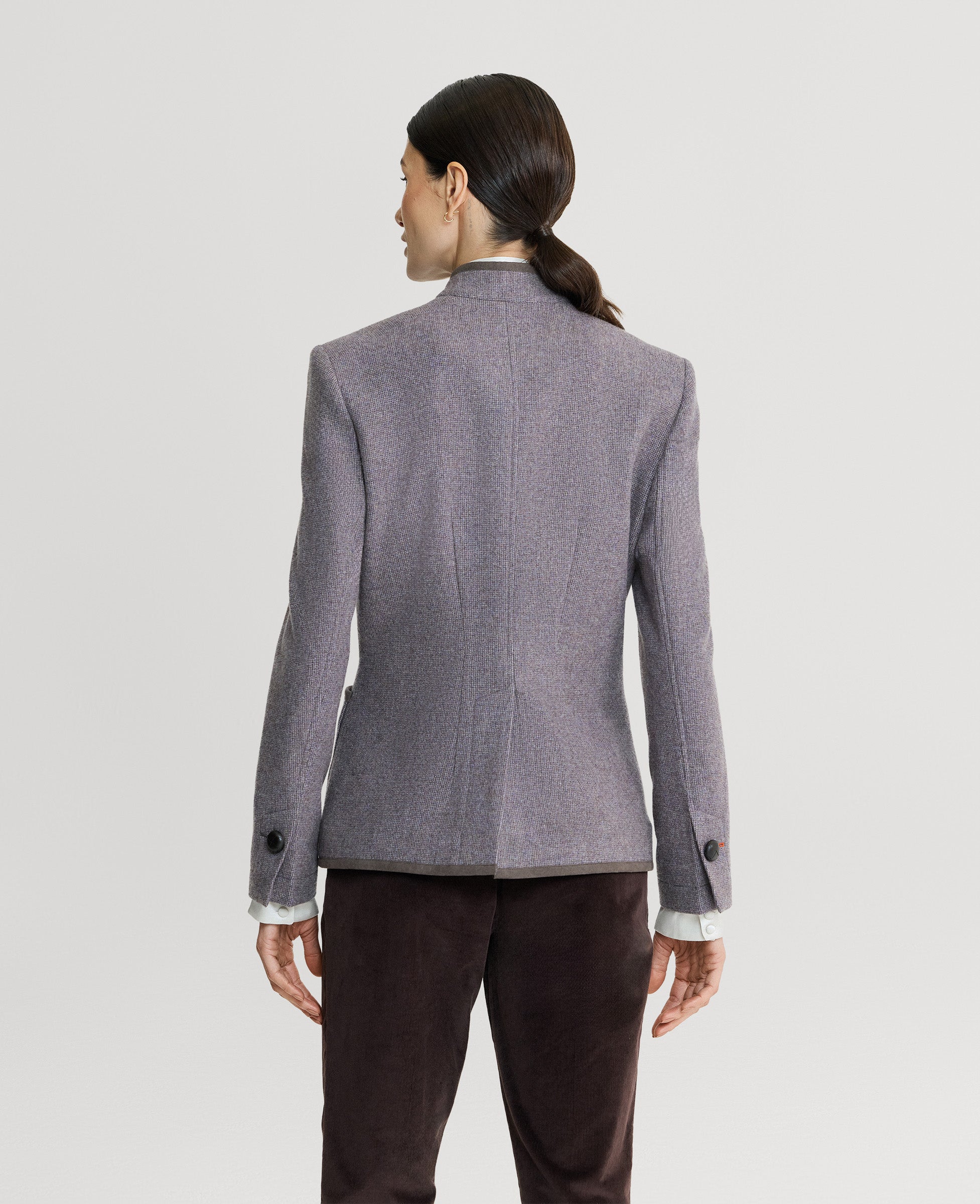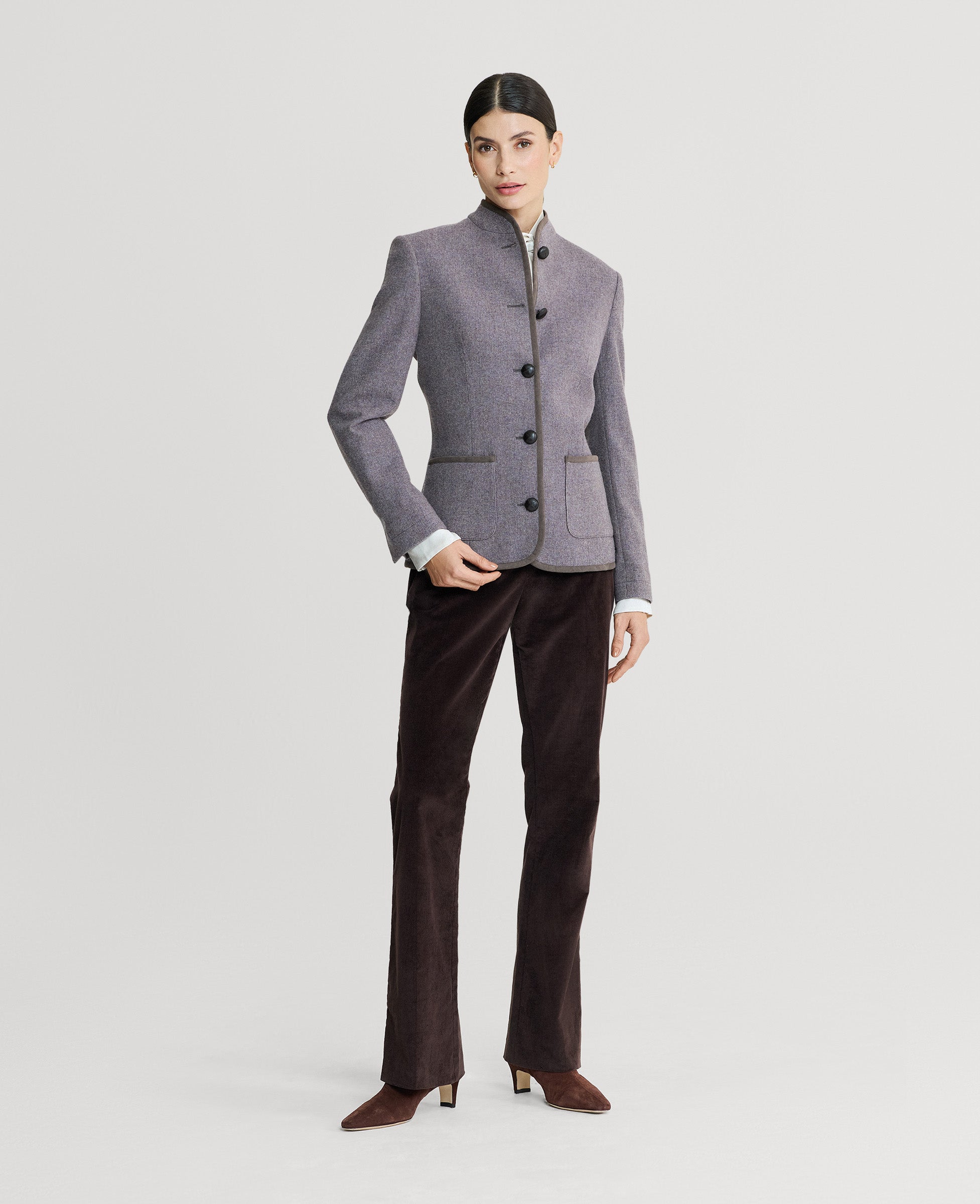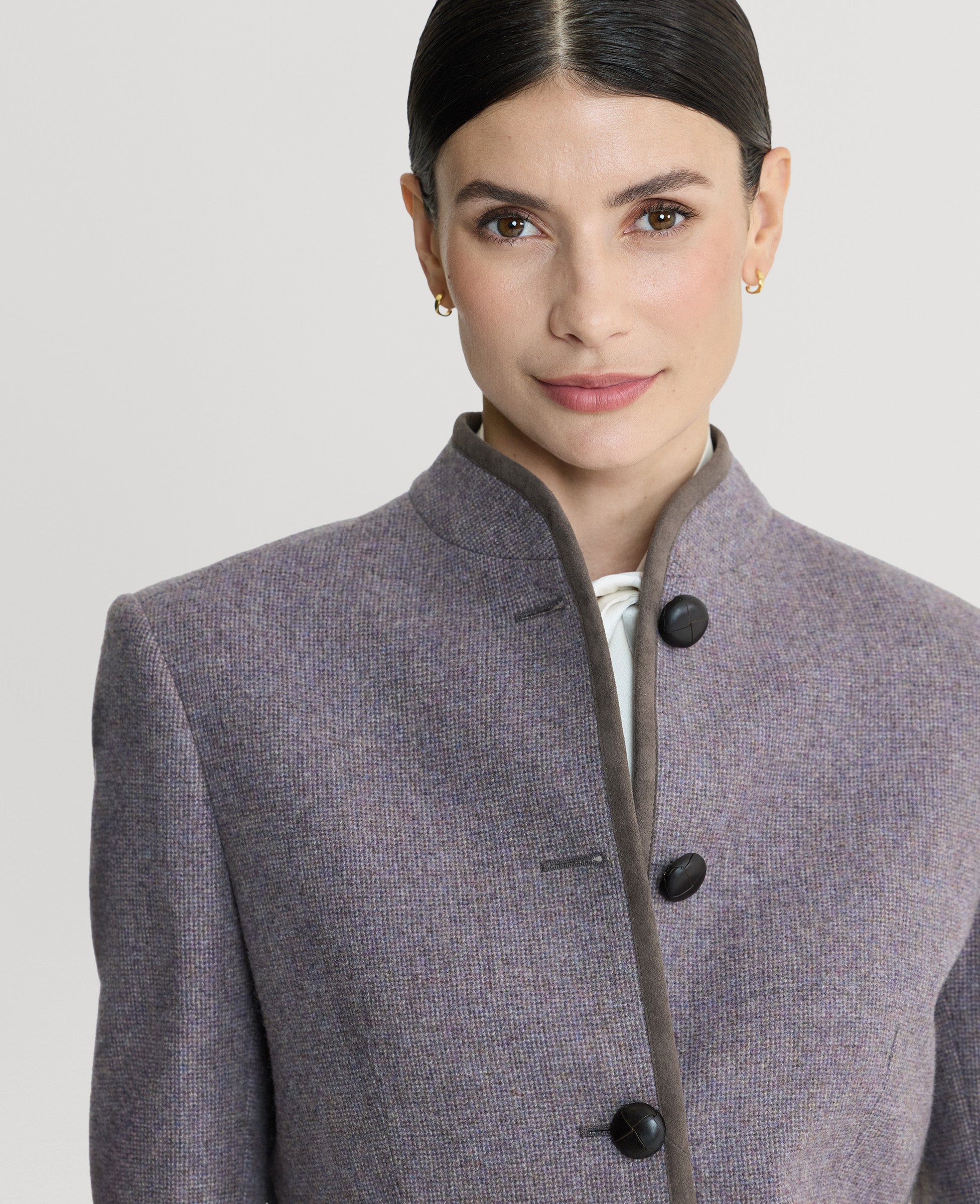 Tailored for timeless style, the Wiltshire Tweed Jacket is part of our Country Collection. Crafted from 100% lambswool in a soft heather purple, it features supple leather buttons, Alcantara trim detailing, and a full branded lining. Designed with a flattering, structured silhouette, this jacket combines traditional craftsmanship with refined country elegance.