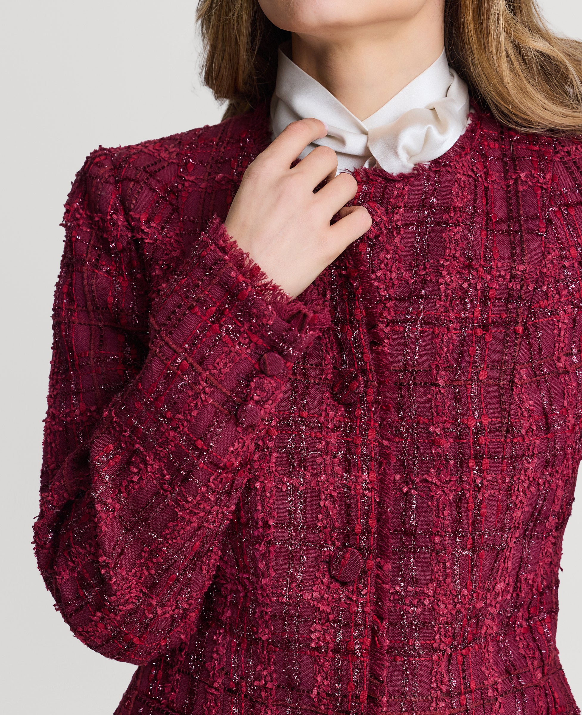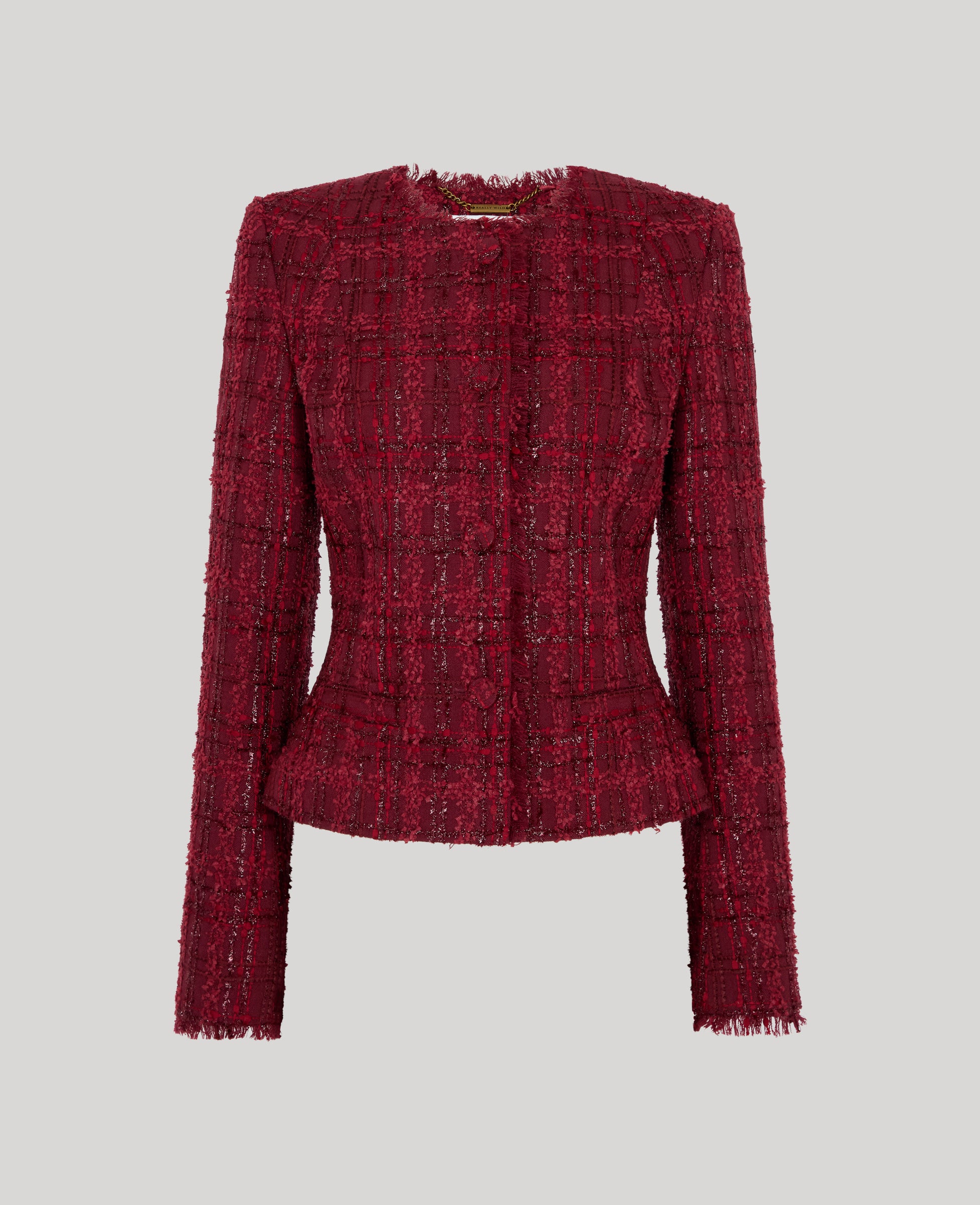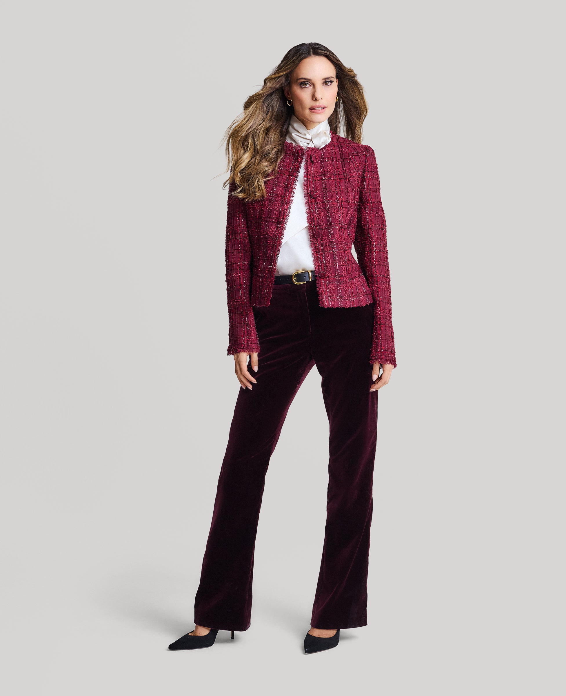 A modern feminine take on a classic suit jacket, the Audrey jacket is the perfect layer for both smart and casual looks. Crafted in an oxblood boucle with subtle texture and frayed edges, it works beautifully with jeans and a tee, or teamed with one of our Somerset shift dresses. It is a timeless piece you will reach for season after season.