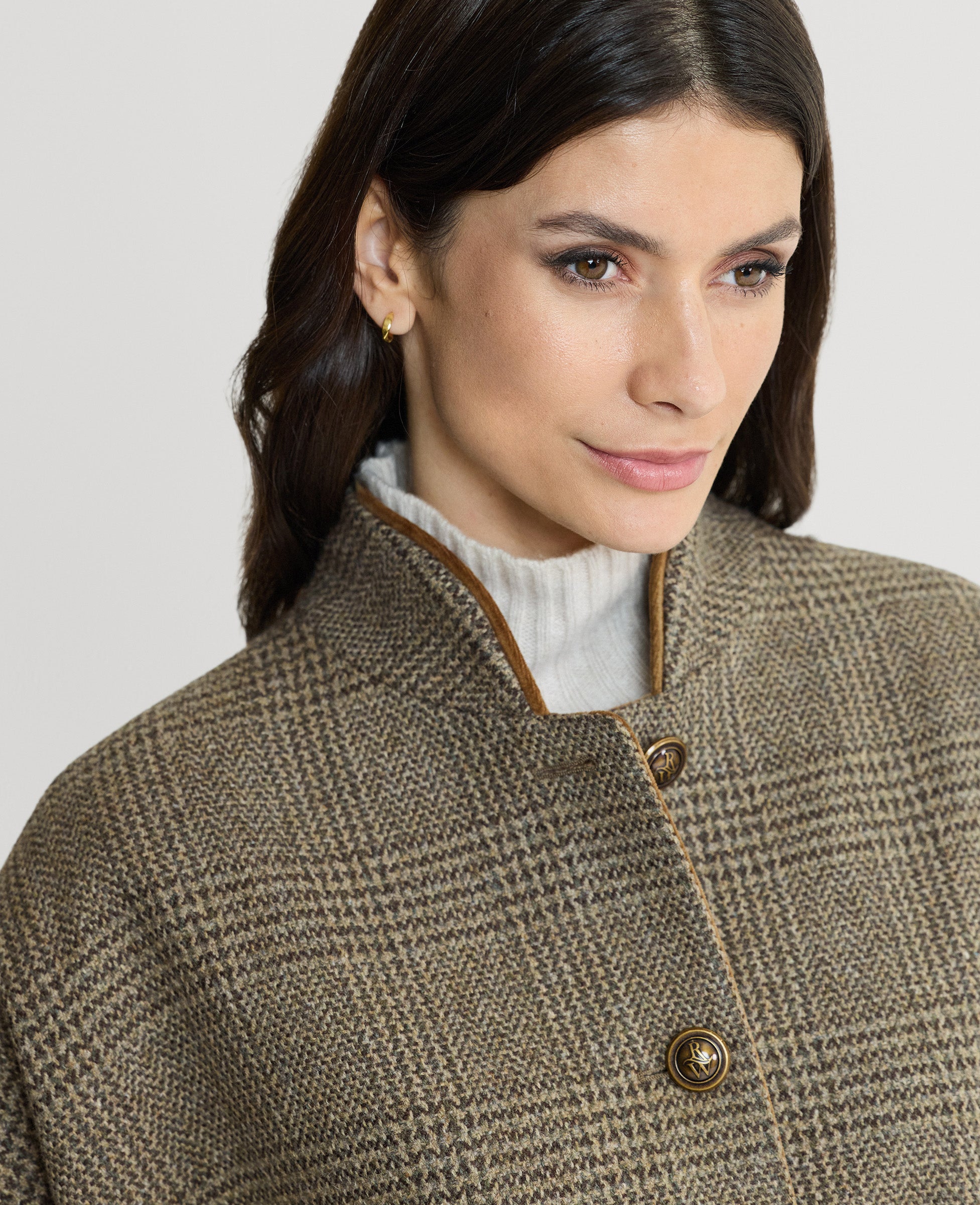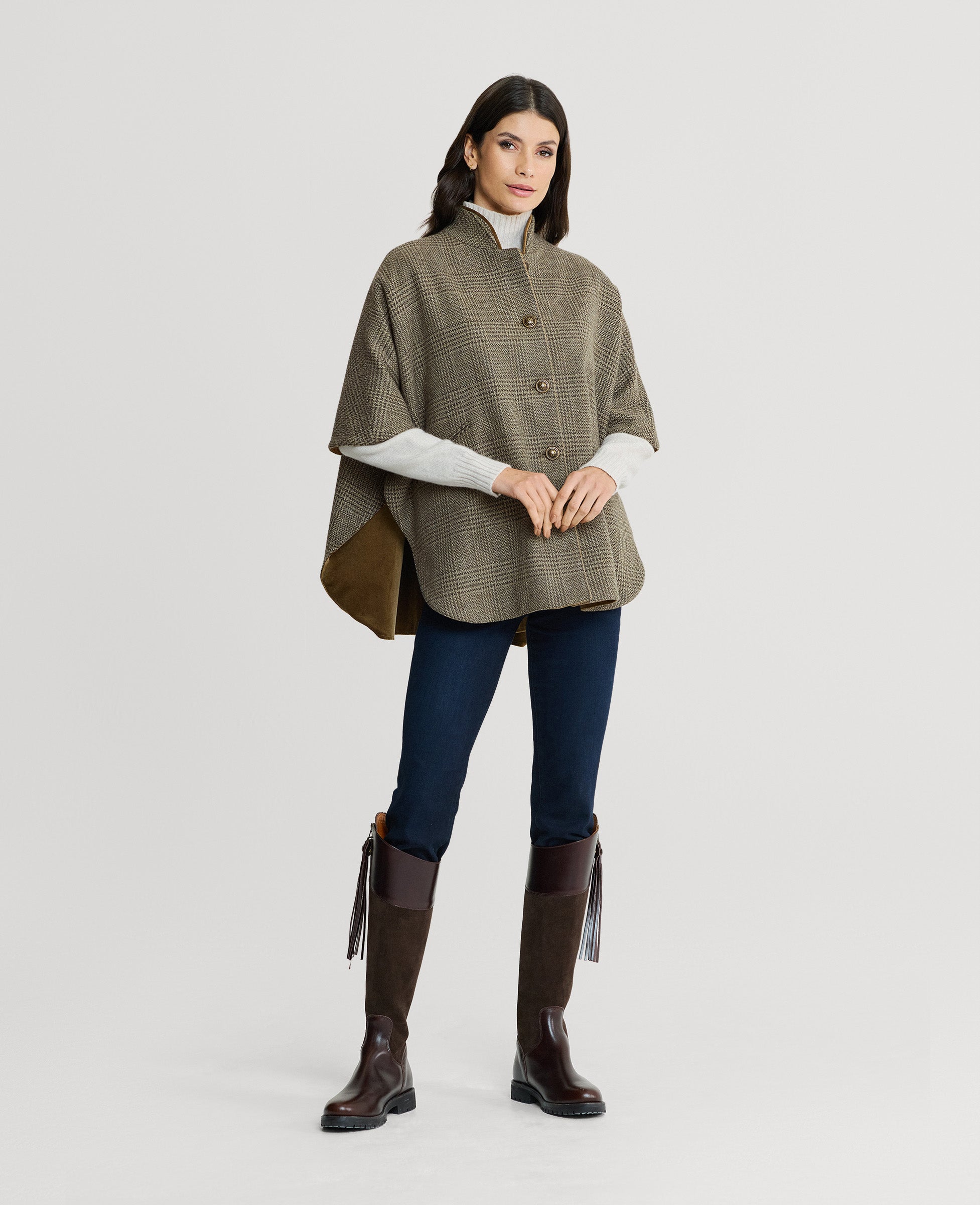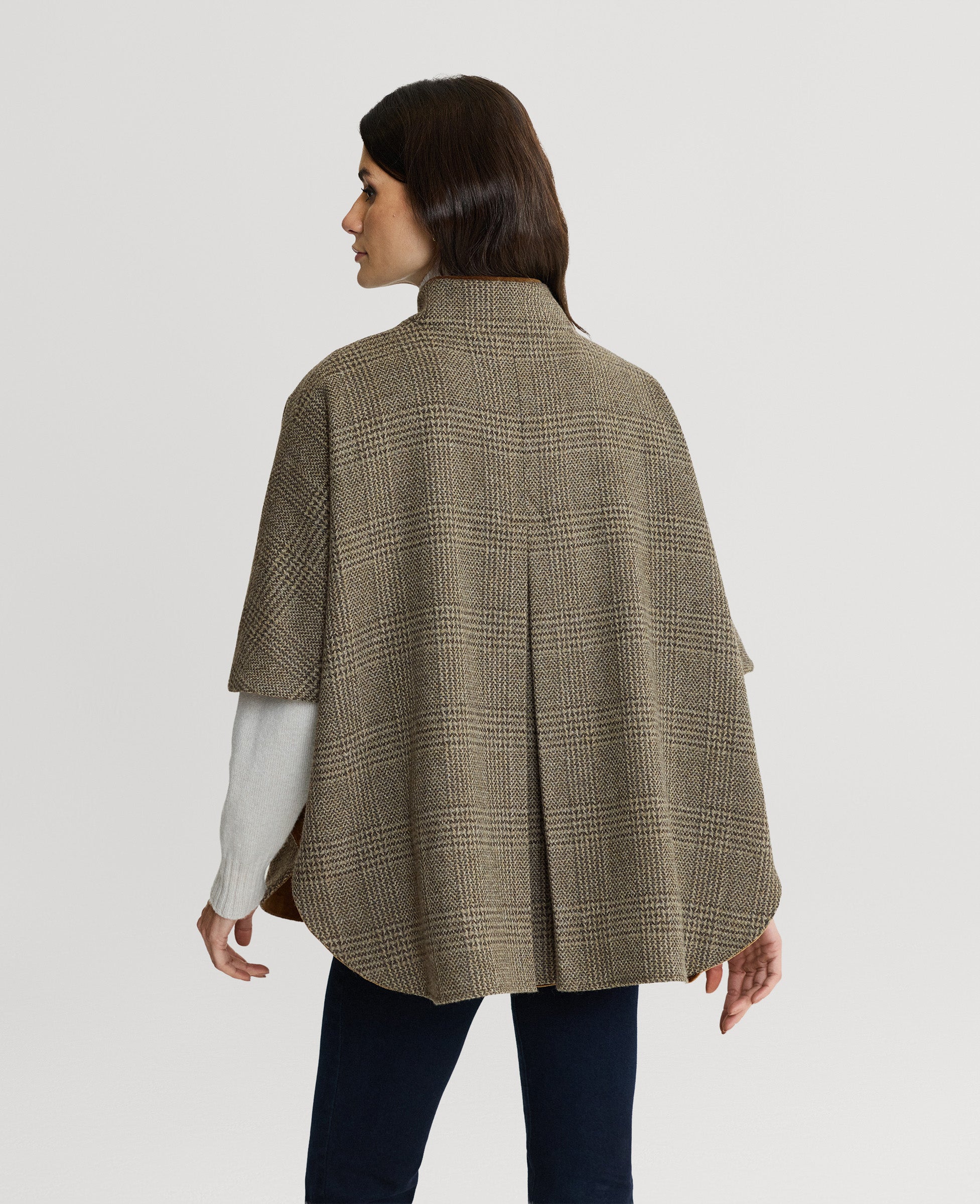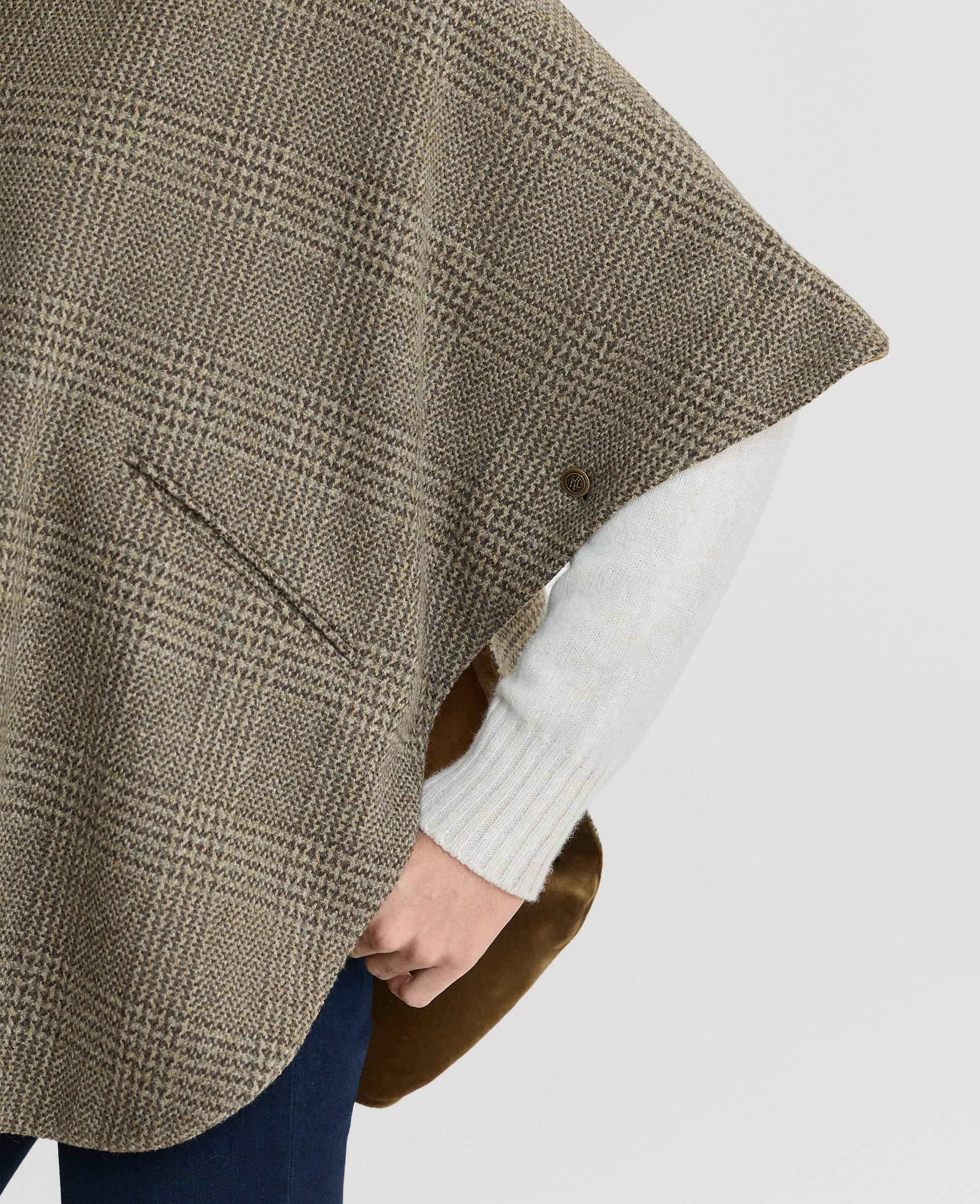 100% Wool Tweed Reversible Beaufort Cape in Sage, Brown & Taupe Check