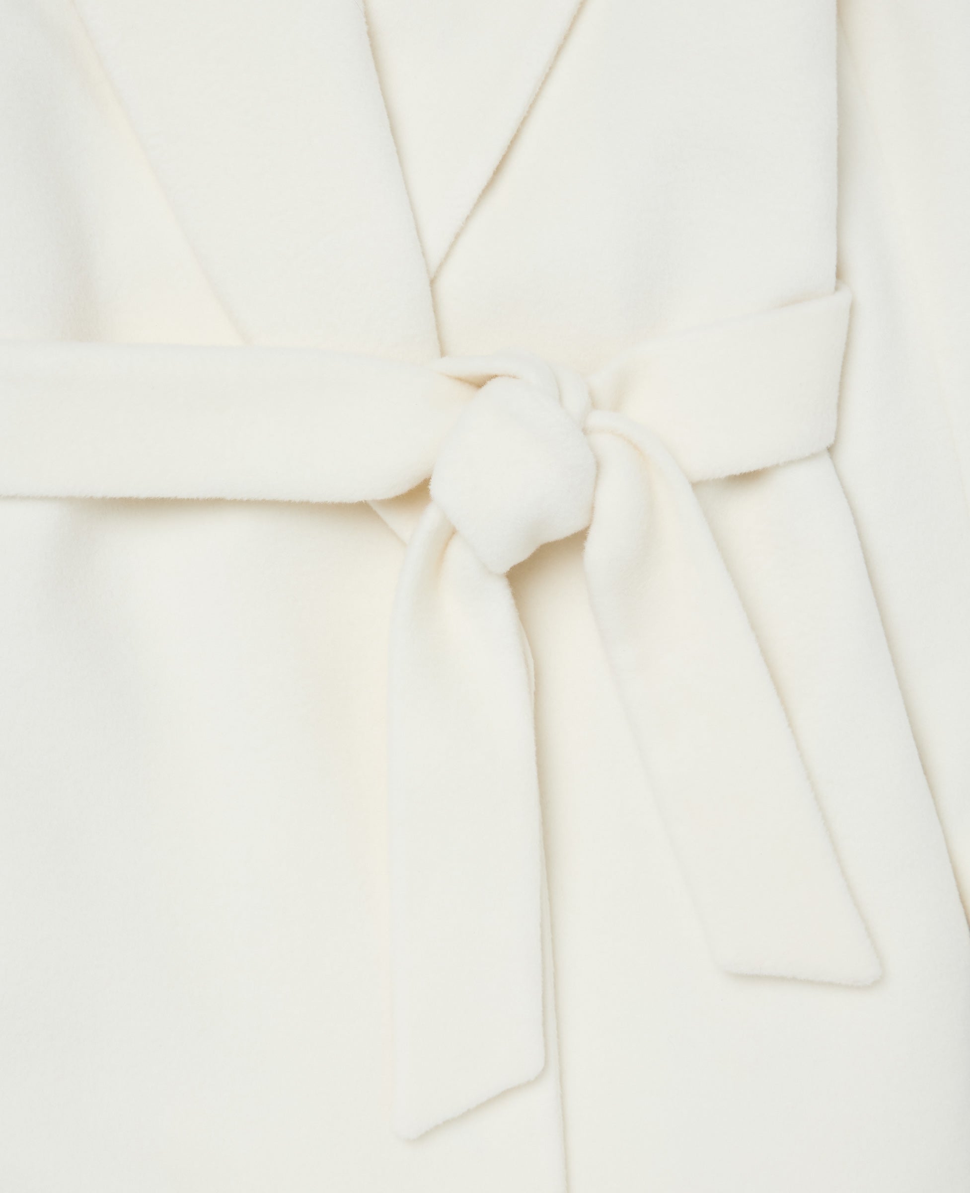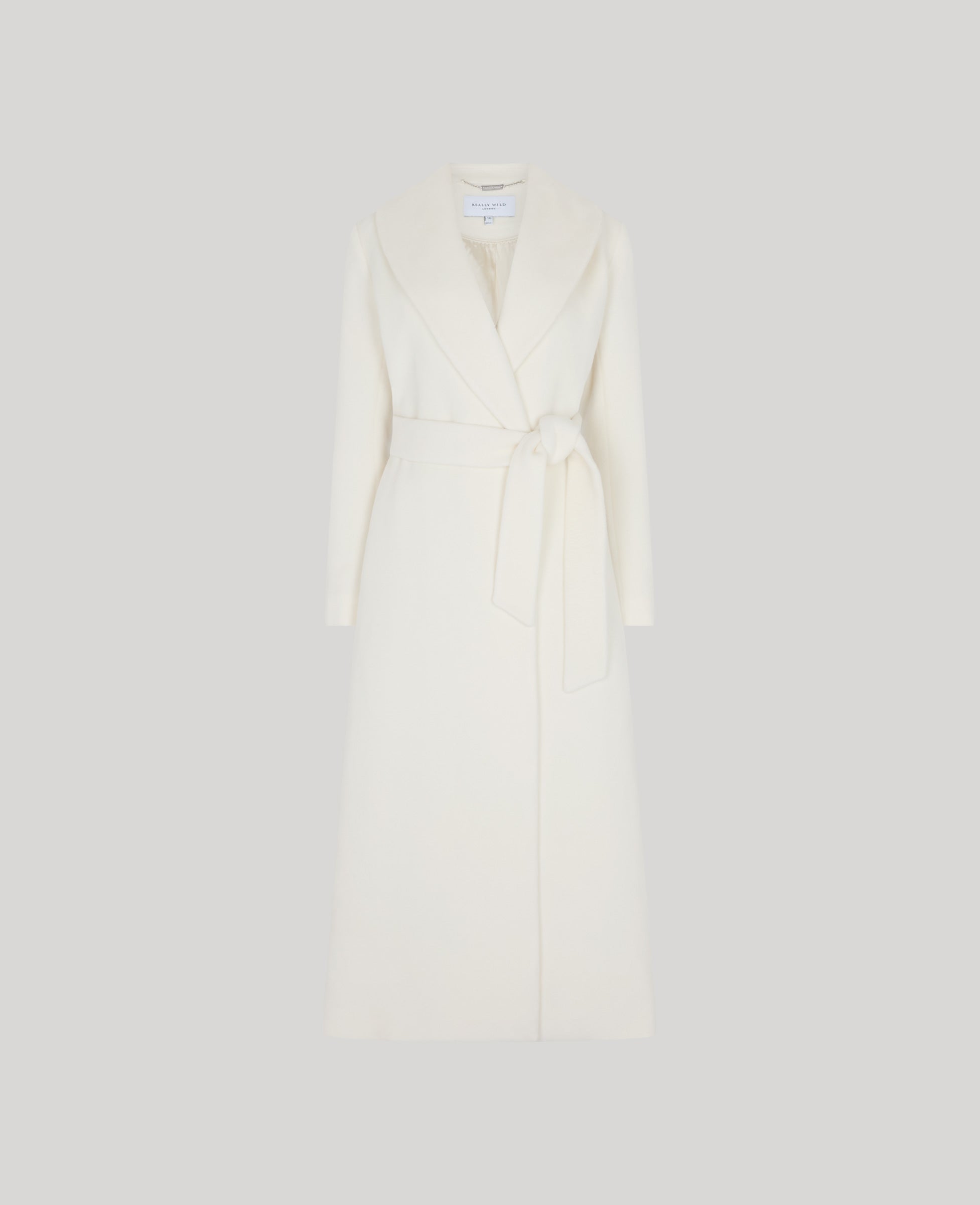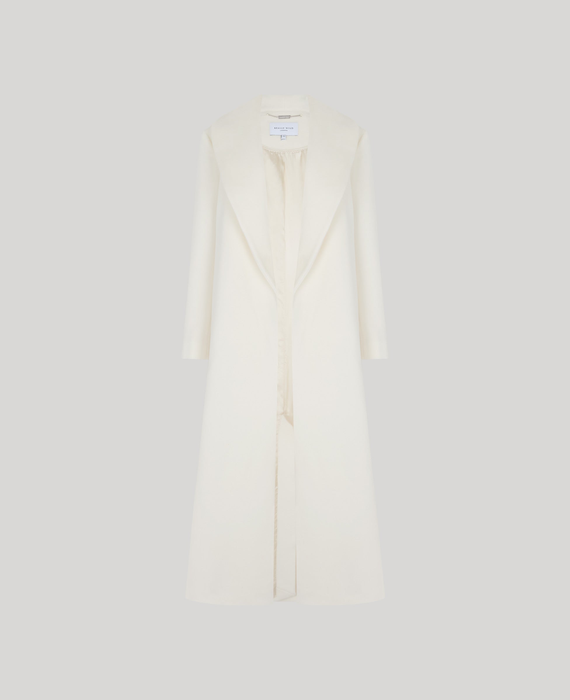 This longline Bianca coat in cream is tailored from superfine merino wool for a refined, fluid drape. A detachable fabric tie belt defines the waist, while a clean shawl collar completes the elegant wrap design. A luxurious outerwear staple that moves effortlessly from day to evening.