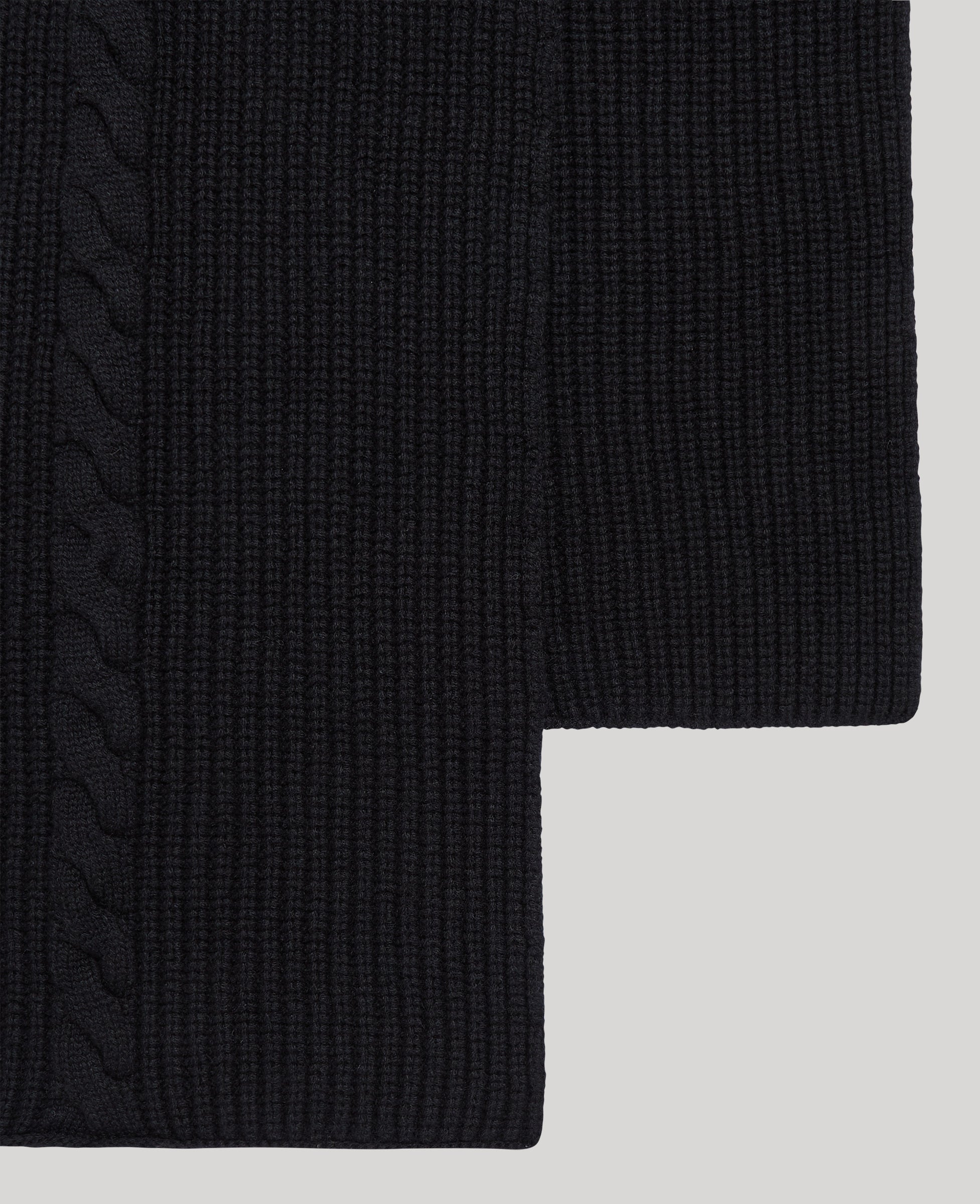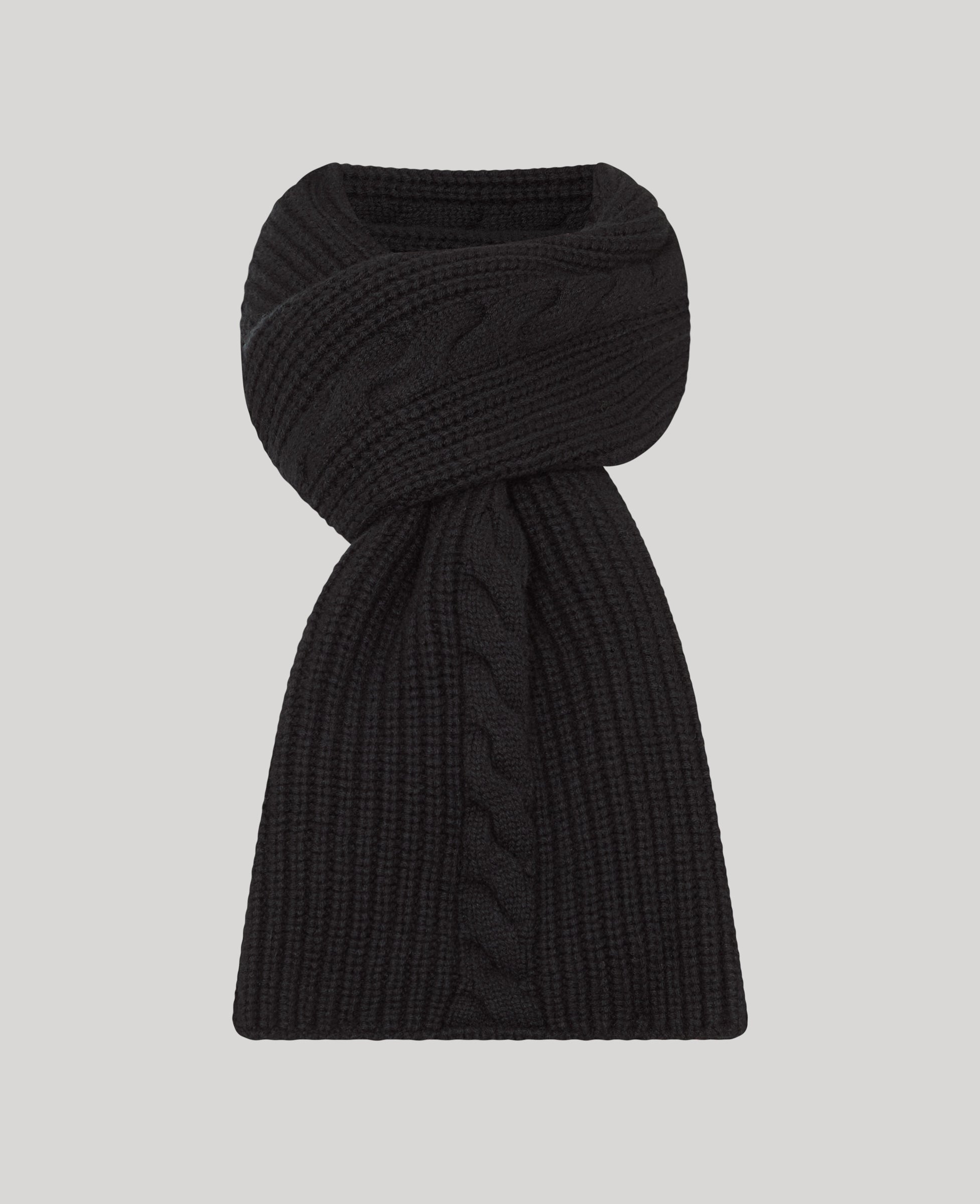 Our simple yet elegant cashmere scarf adds effortless warmth and sophistication to winter days. Crafted in Scotland, the scarf features a statement cable design and pairs effortlessly with our matching black beanie for a timeless, refined coordinated look.