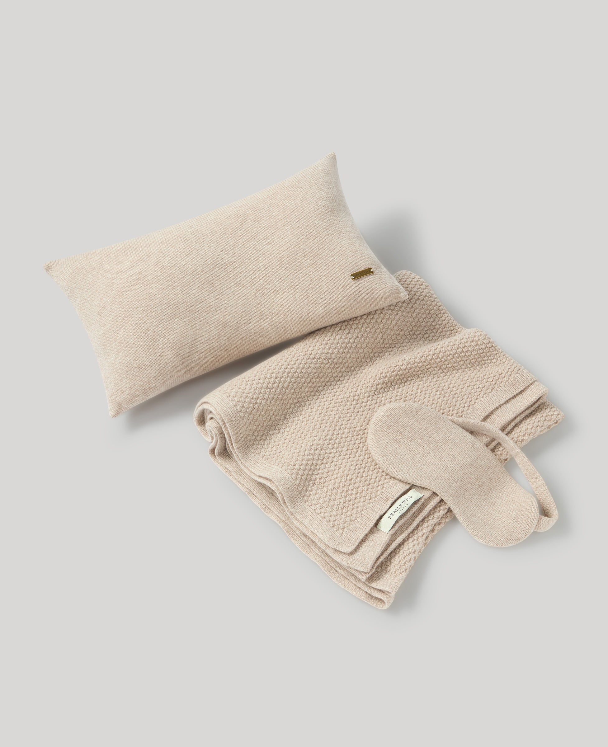 Made in Scotland from 100% cashmere, our travel set in a natural colour-way comprises a cashmere-silk lined eye mask and poncho. Ultra soft and featherlight for packing neatly into weekend luggage, or to indulge with during air travel. The poncho packs neatly into a matching cashmere pouch, which can also be used for travel essentials or doubled up as a travel pillow.