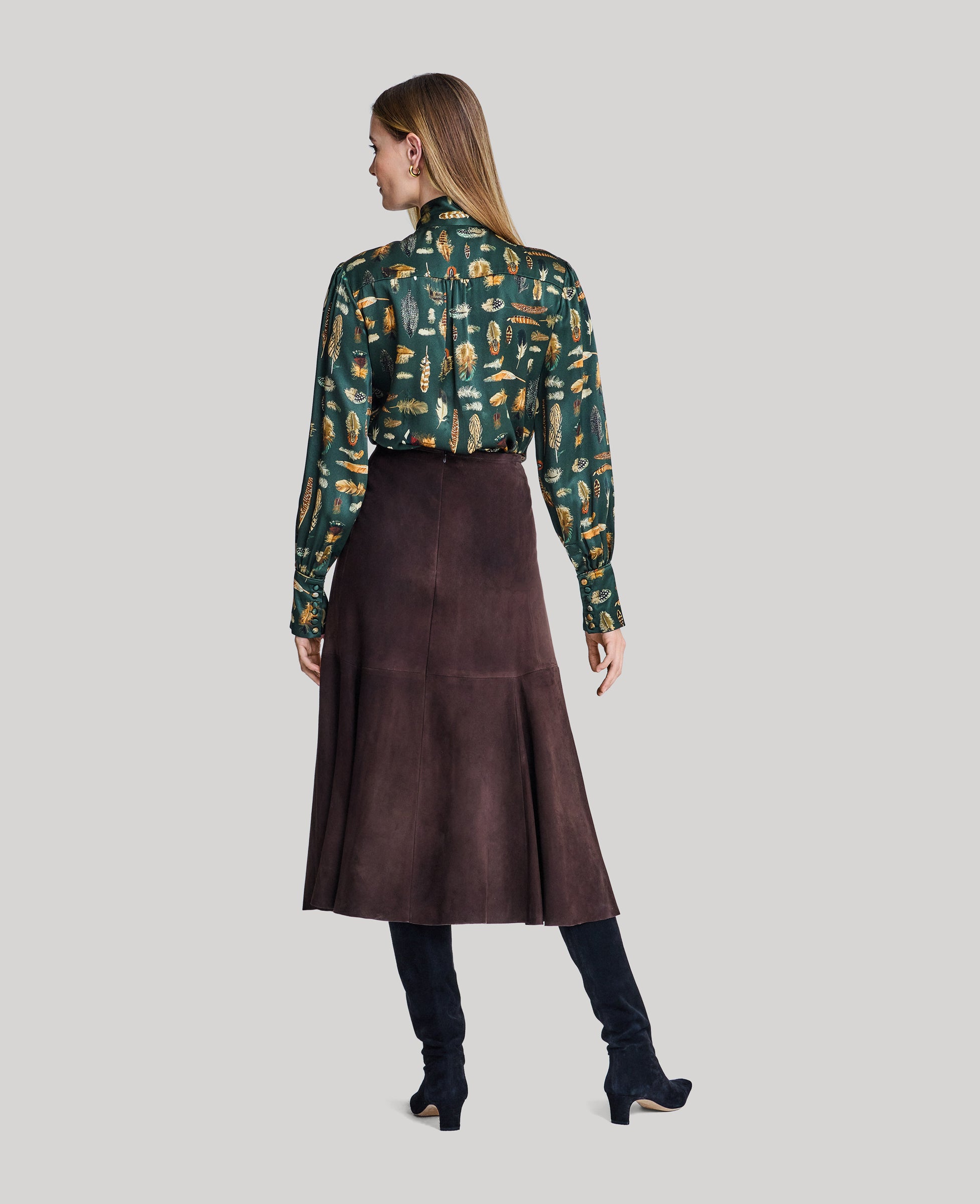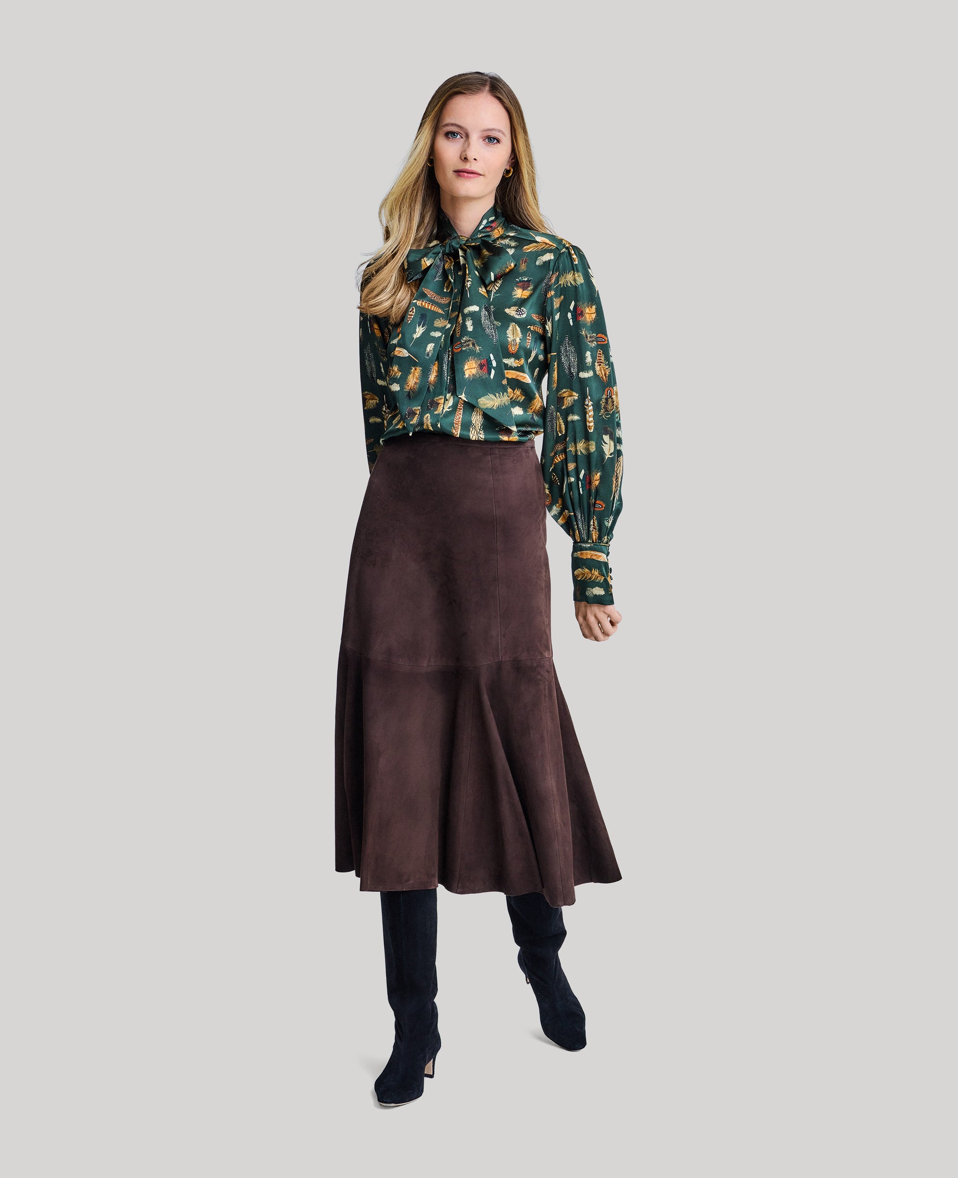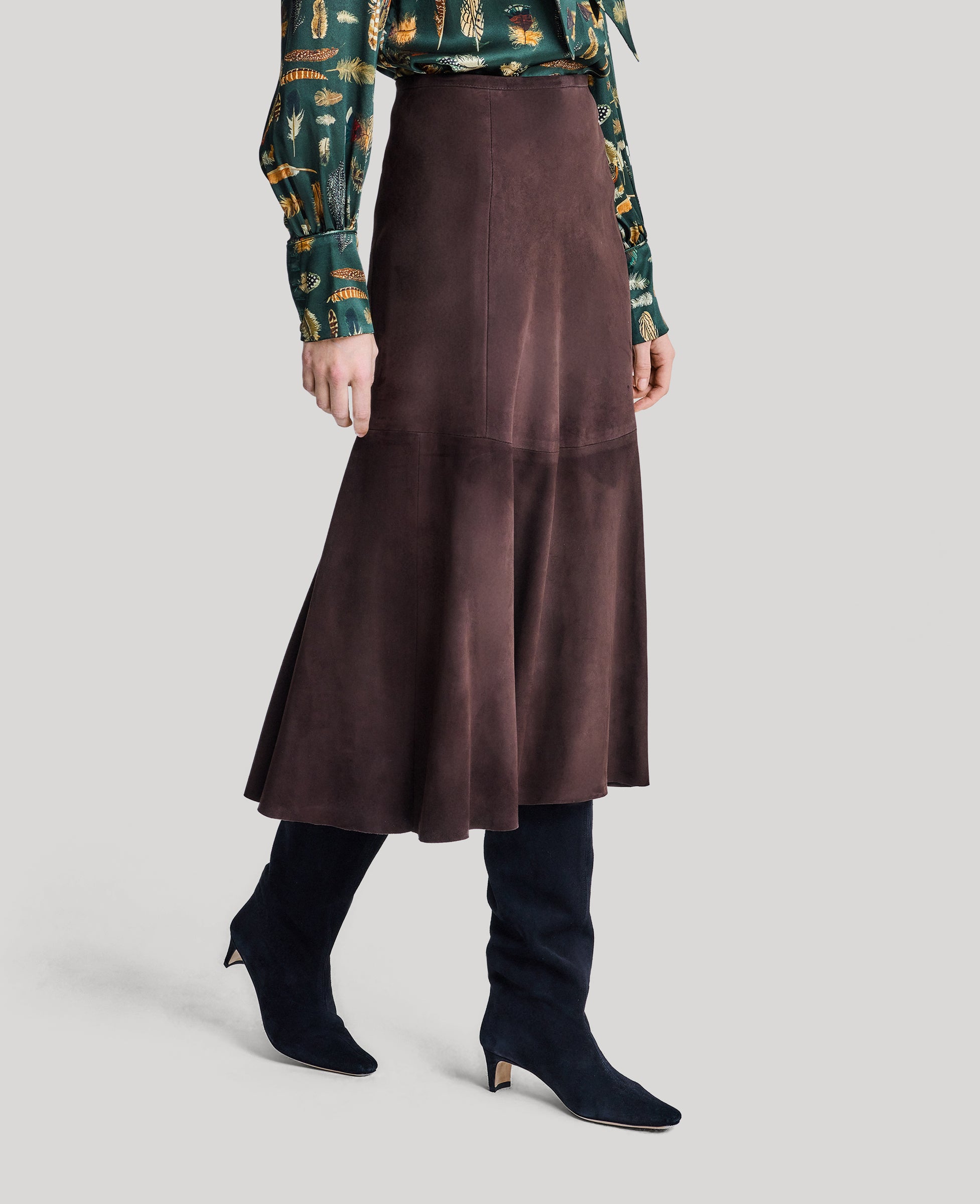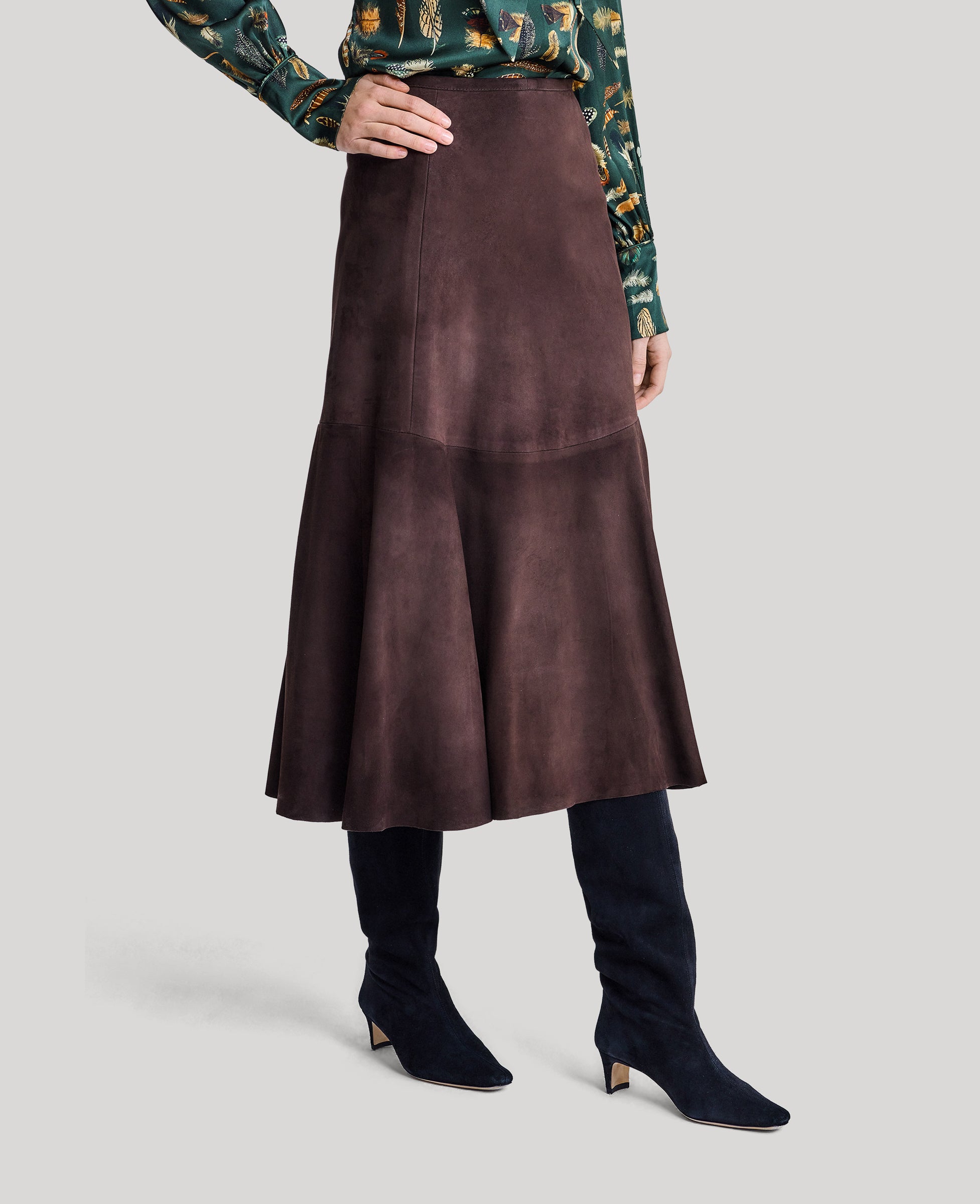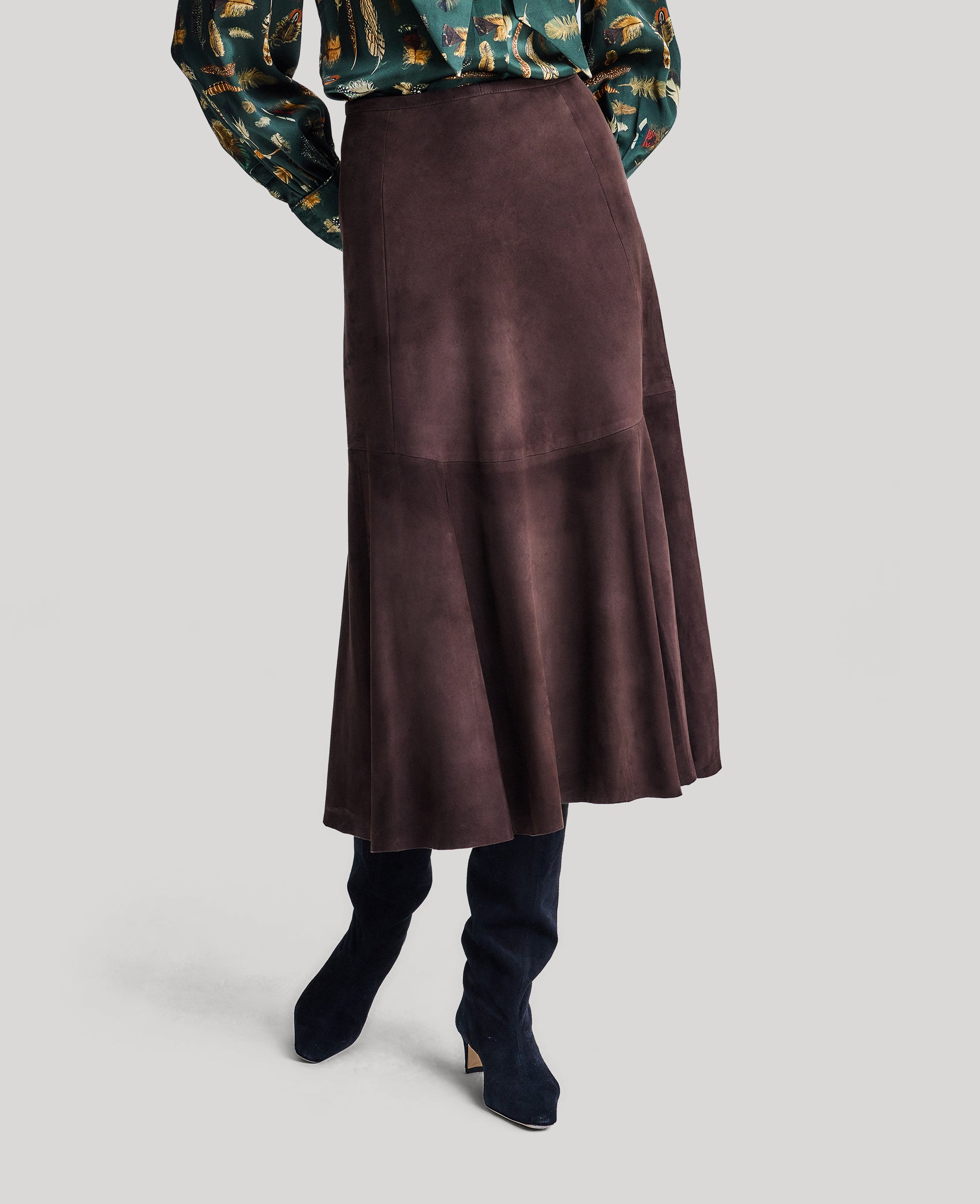 A long flippy Suede skirt beautifully finished with tiered panel and concealed back zip fastening. A versatile design that is suitable for all country pursuits as well as for city look with its distinctively flattering cut.