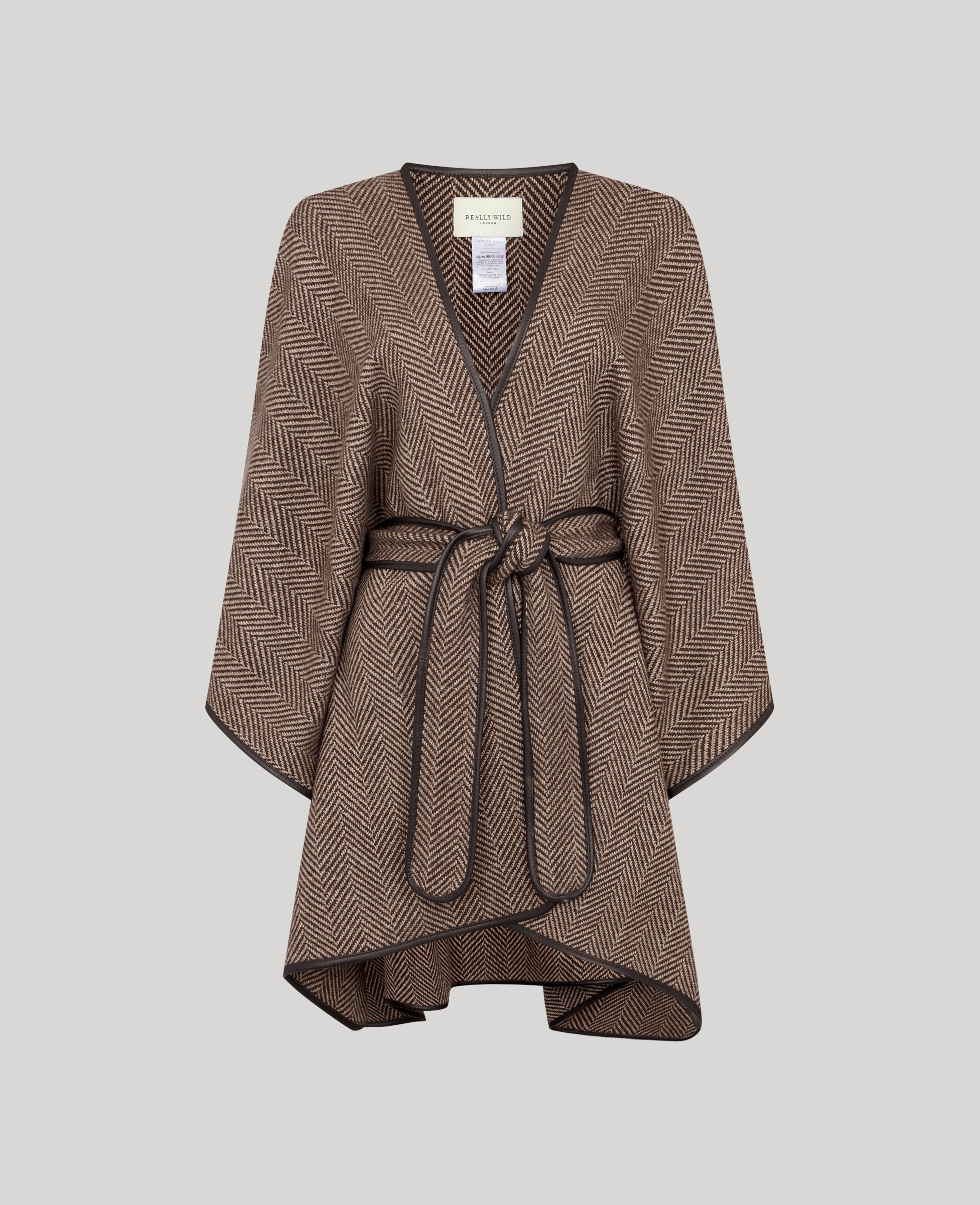 Cashmere & Wool Mix Katherine Herringbone Belted Cape - Chocolate