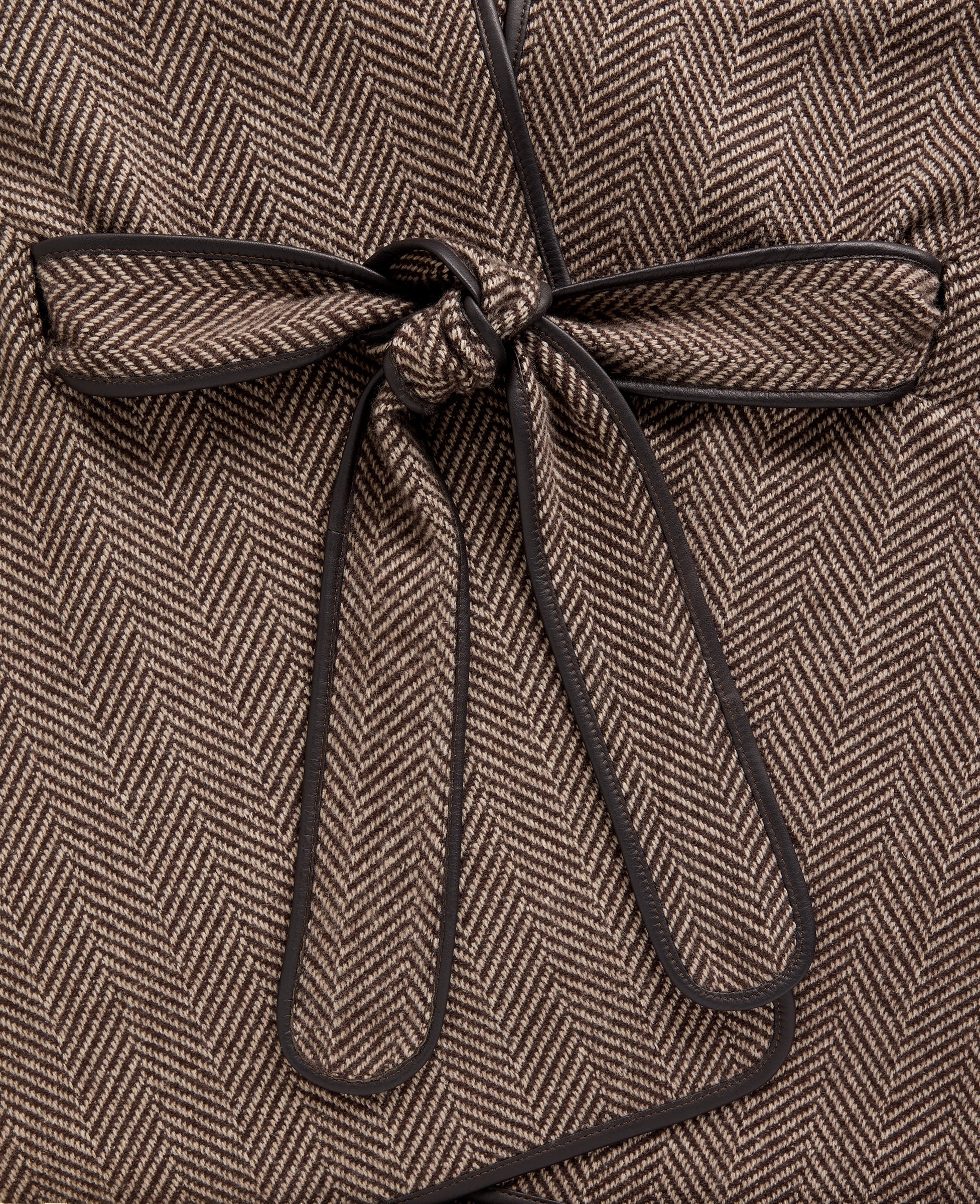 Our Katherine Cape in herringbone is made in the UK and bound in leather. Designed to be worn open or belted, it layers effortlessly over tailoring or knitwear. Tonal and versatile, it transitions seamlessly from town to country.