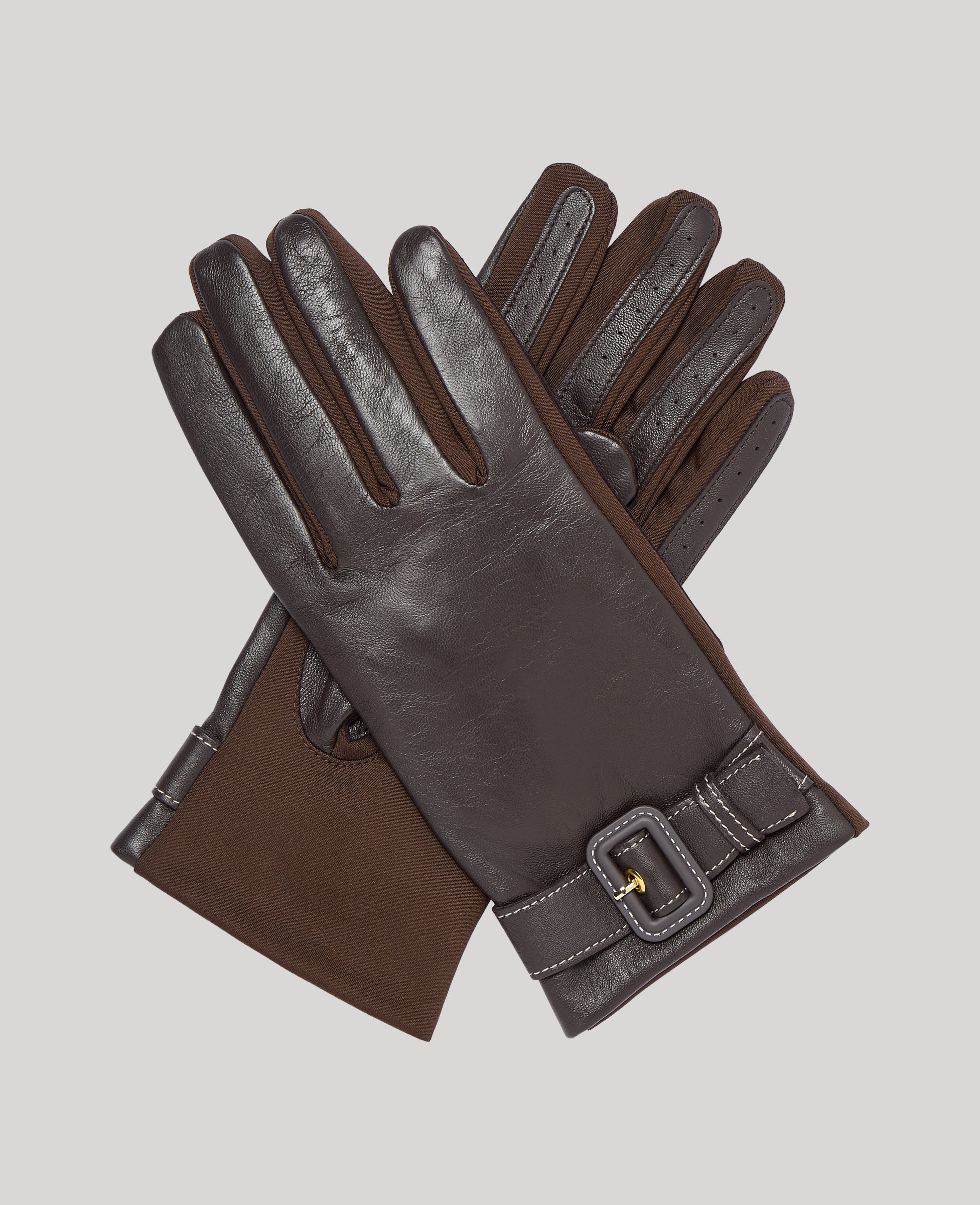 A timeless blend of elegance and ease, our Lyla Gloves are crafted from supple leather and soft stretch fabric for a contoured fit. Lightly treated to offer protection against the elements. Finished with a statement buckle and subtle contrast stitching, they're the perfect finishing touch for both town ad country dressing.