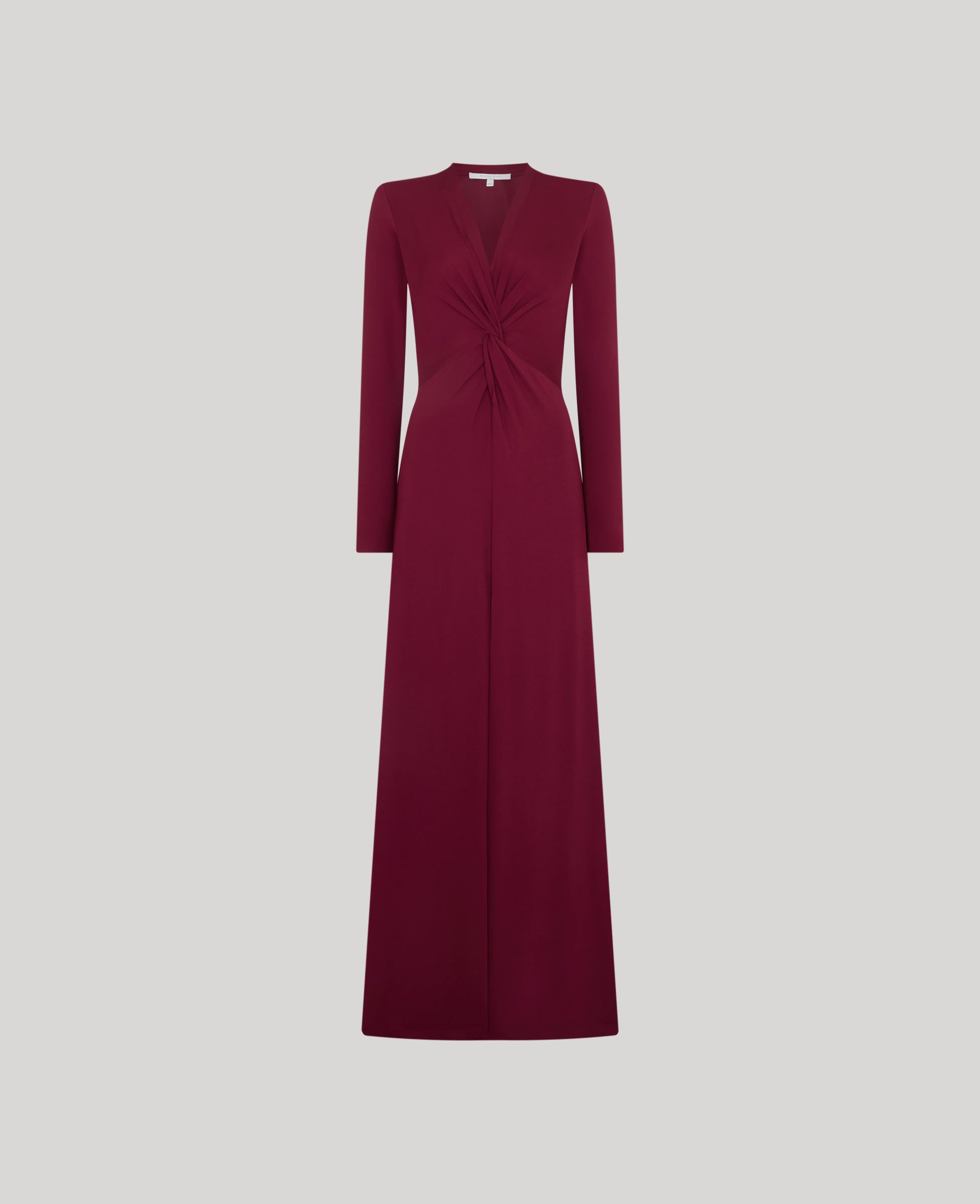 Designed to flatter the feminine form and make a statement at any event, our Melanie long line jersey dress, crafted in a beautiful oxblood tone, features long sleeves, a flattering V-neckline, front twist detail and a subtle front split that creates a sophisticated, elegant silhouette. Pair with one of our mouflon Bianca or Belvedere capes for a striking evening look.