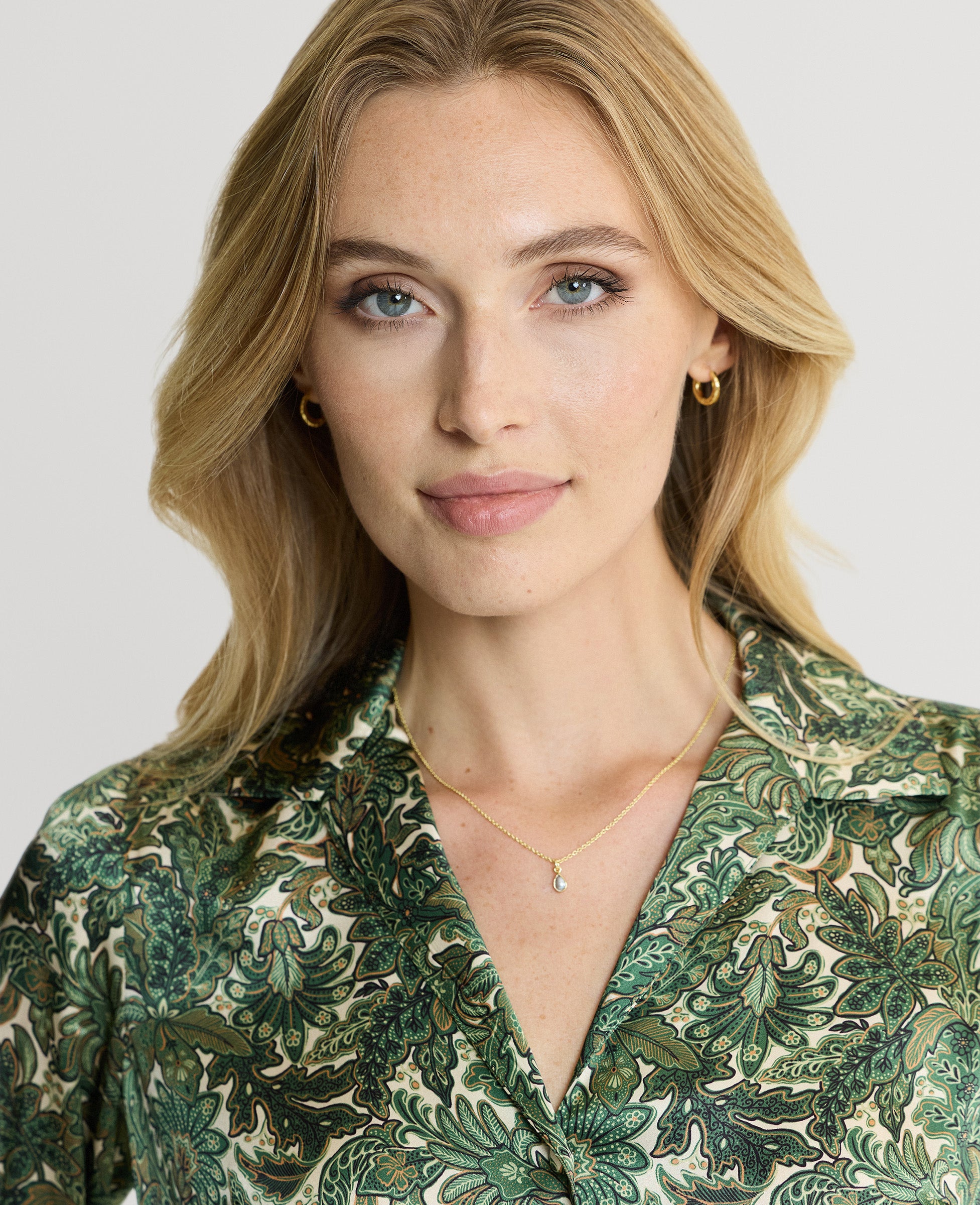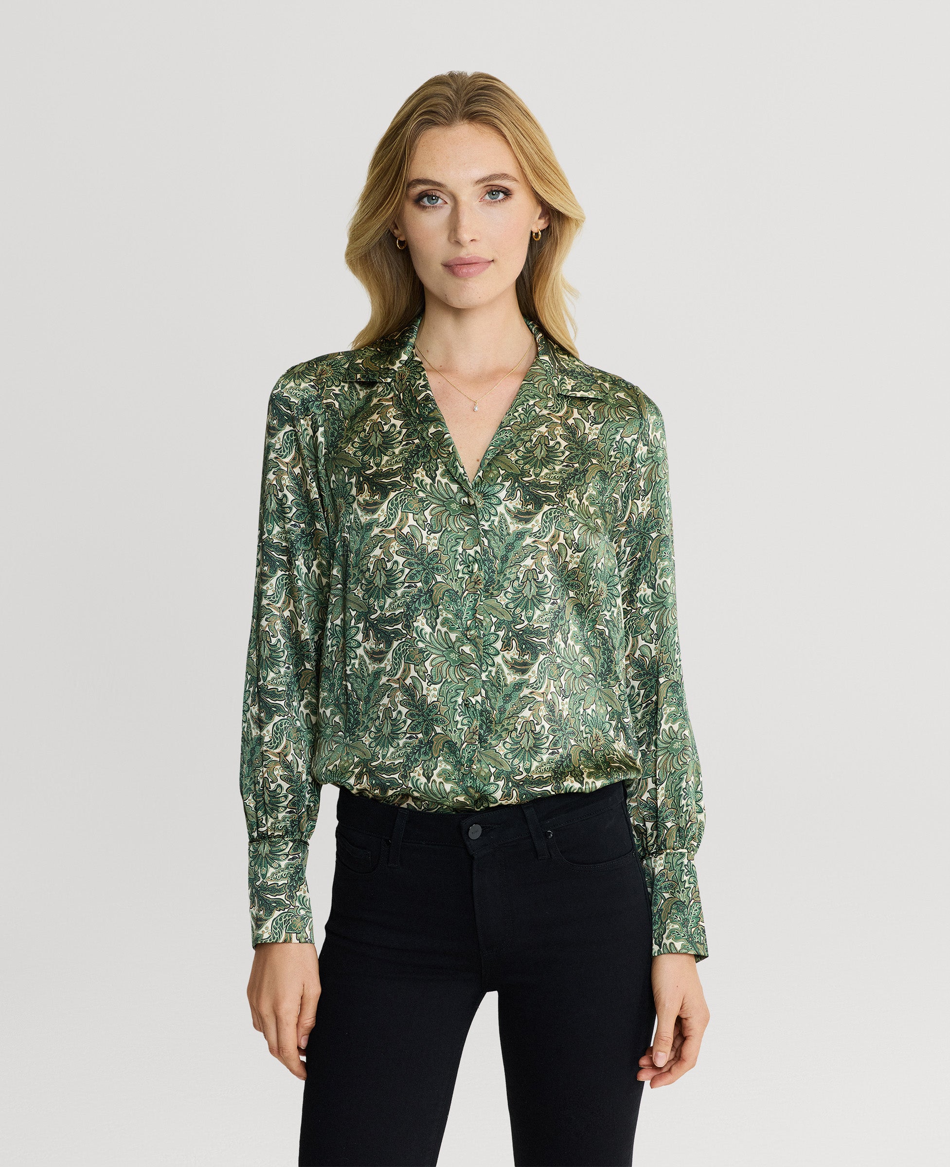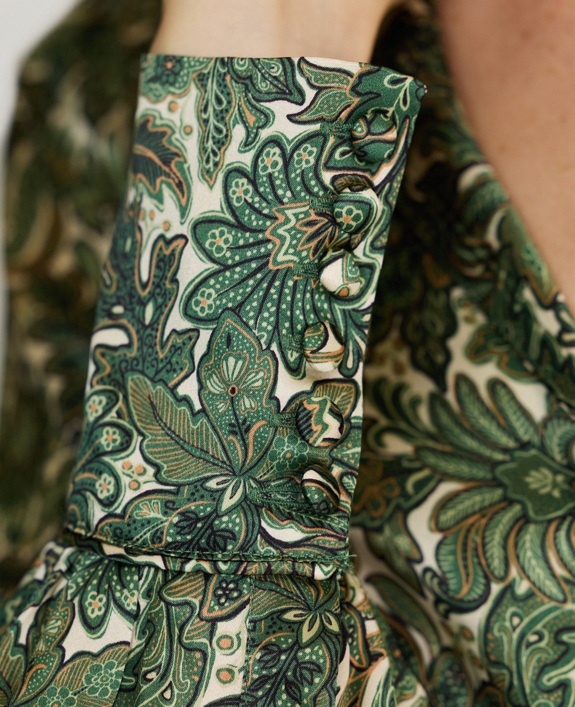 Made from 100% silk our bespoke Liberty Shirt in oak print is an elegant and practical take on the printed shirt dress. Team with our corduroy trousers for a day look or elevate with simple tailoring. Features deep bound cuffs and covered buttons.