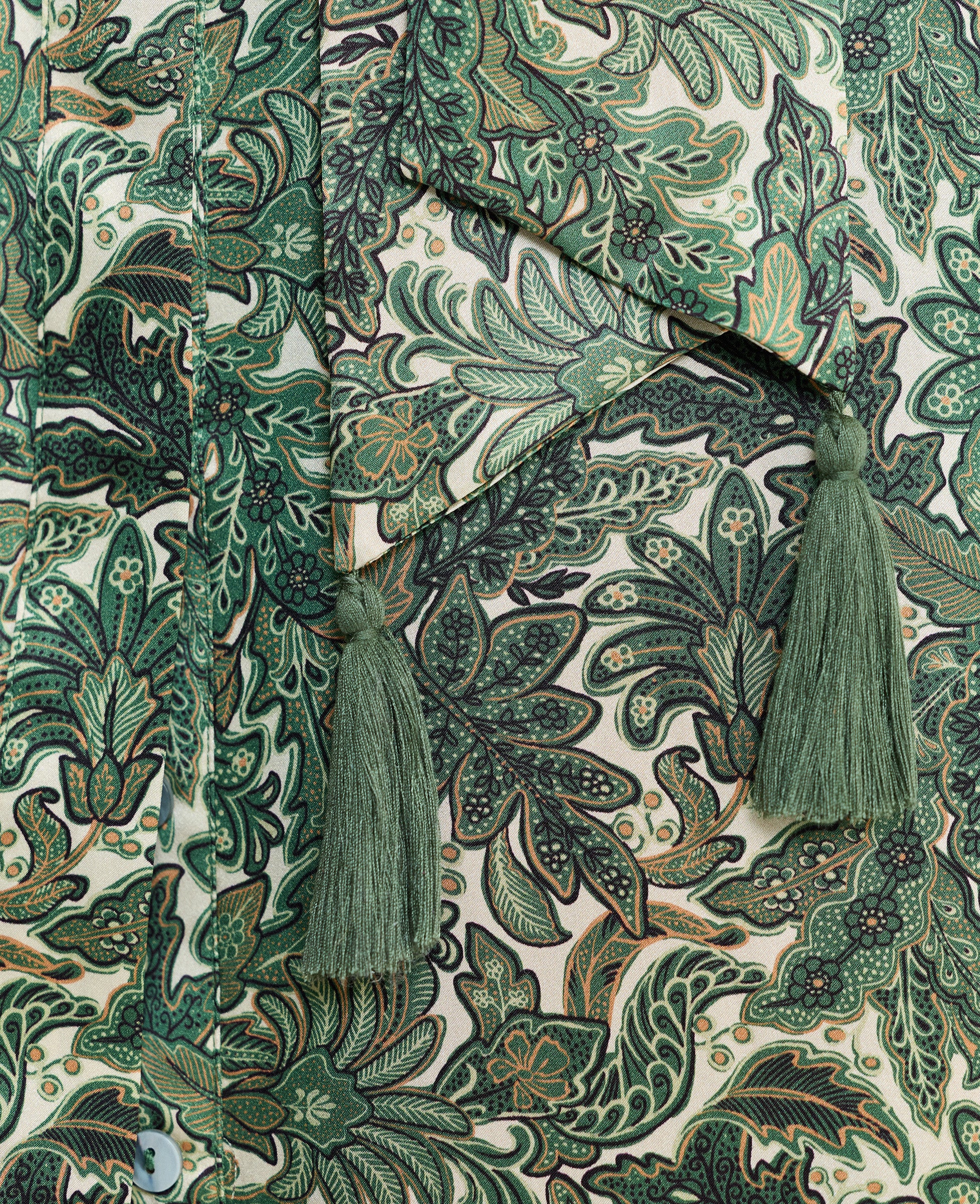 Made from 100% Liberty silk our bespoke Shirt Dress in tones of Moss loden and cream is a piece inspired by nature. The natural fibres enhance movement and line with deep cuffs, a fabric belt and tonal green tassels. The green lining is designed for extra insulation and a further nod to the great outdoors.