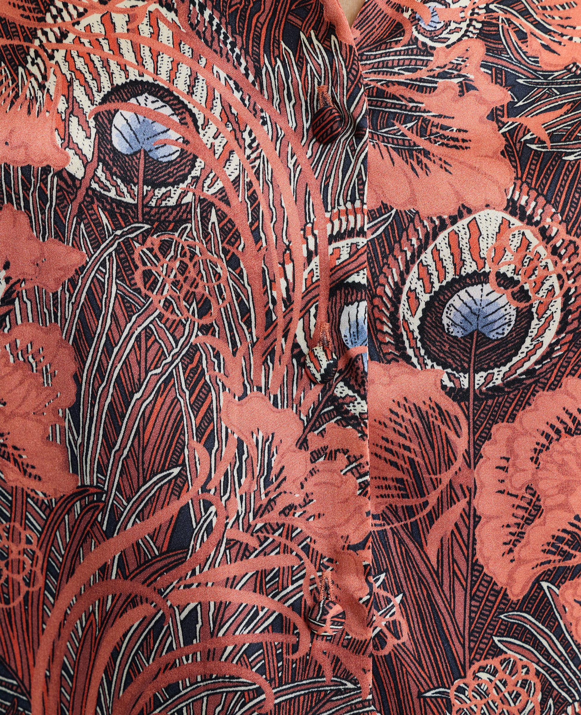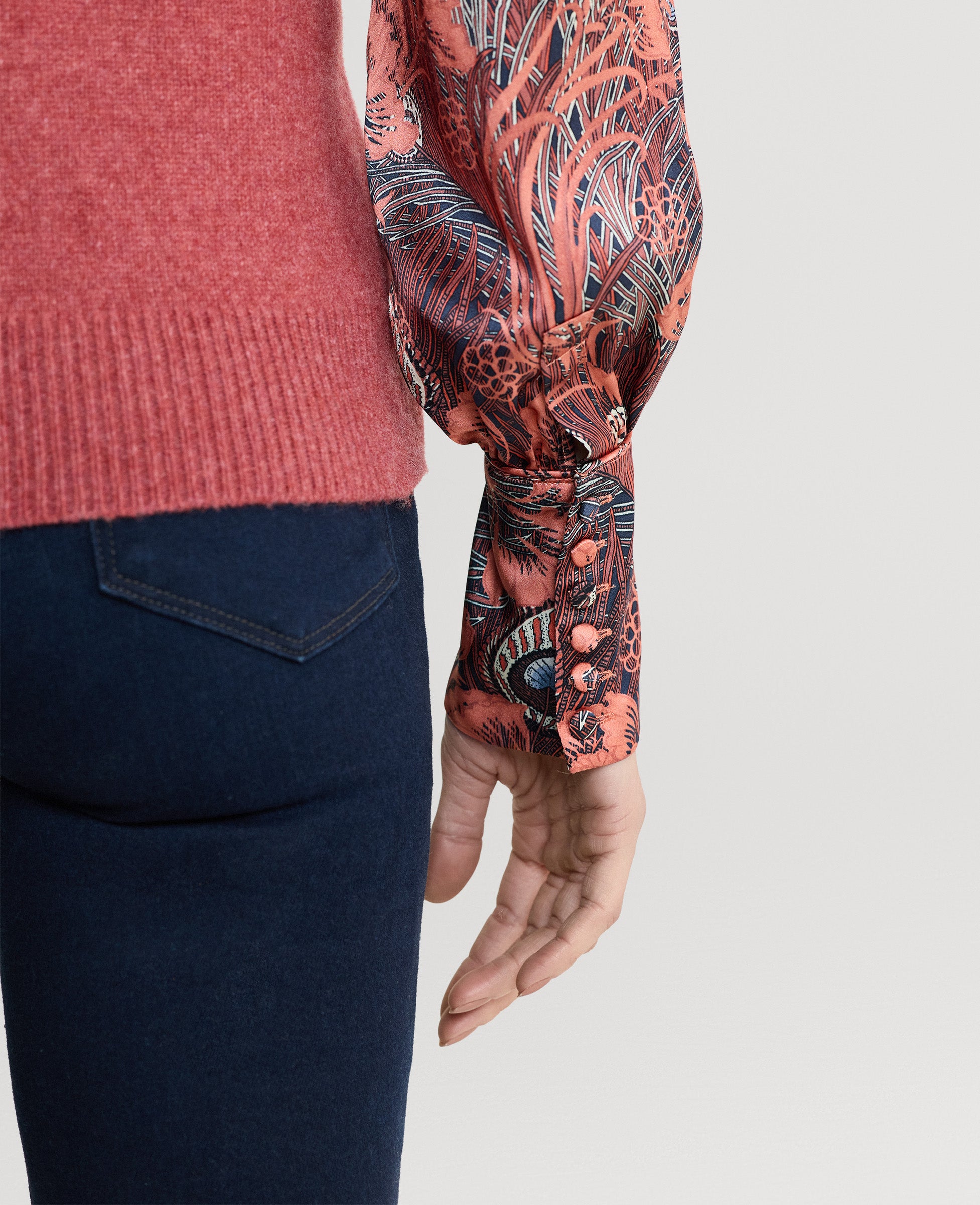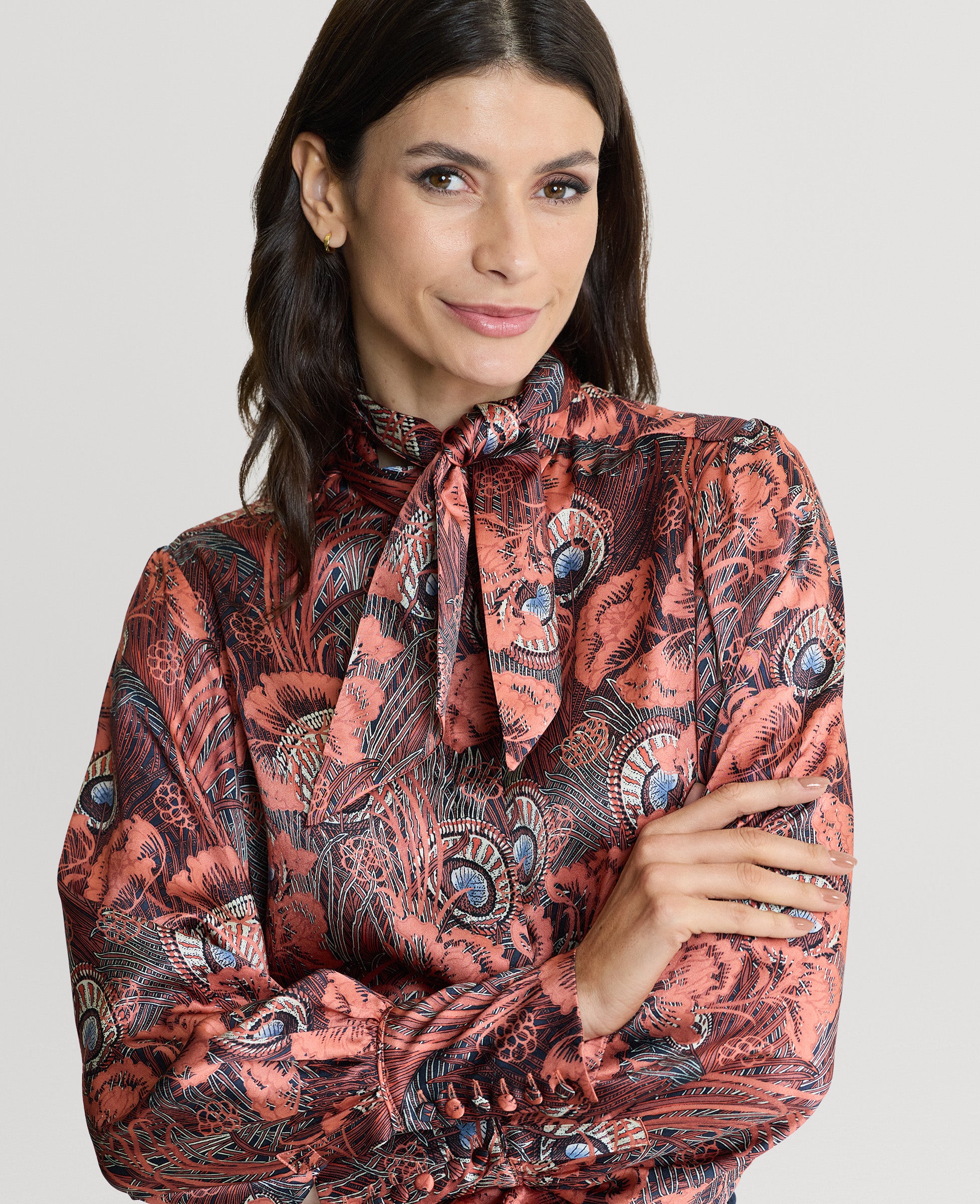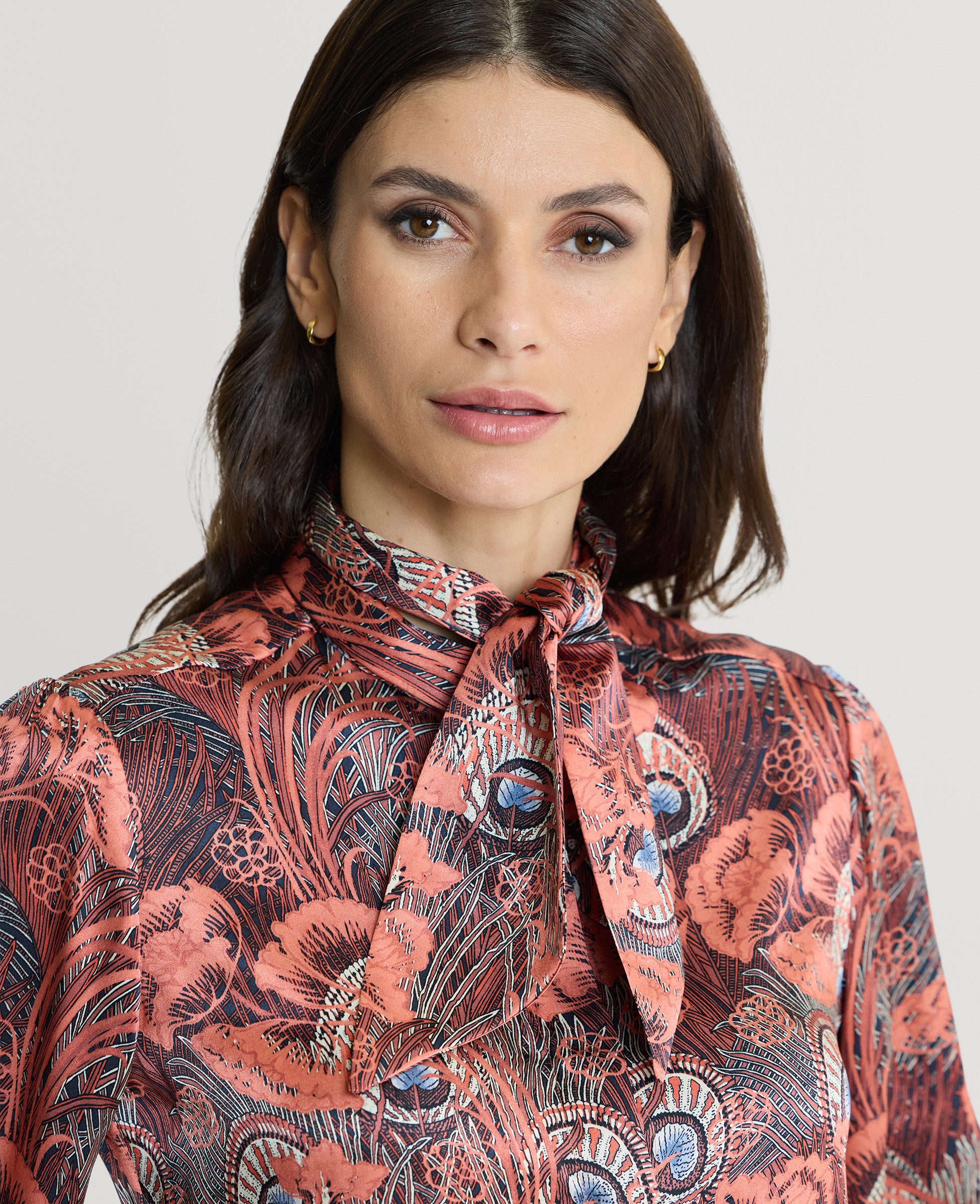Made from 100% Silk from the Liberty archive, this bespoke print has been reimagined in coral to blend with our rust and burnt orange pieces. It showcases an exotic motif where burnt orange and coral are lifted with subtle blue accents. Finished with a tie-neck, it offers multiple ways to style at the neck.