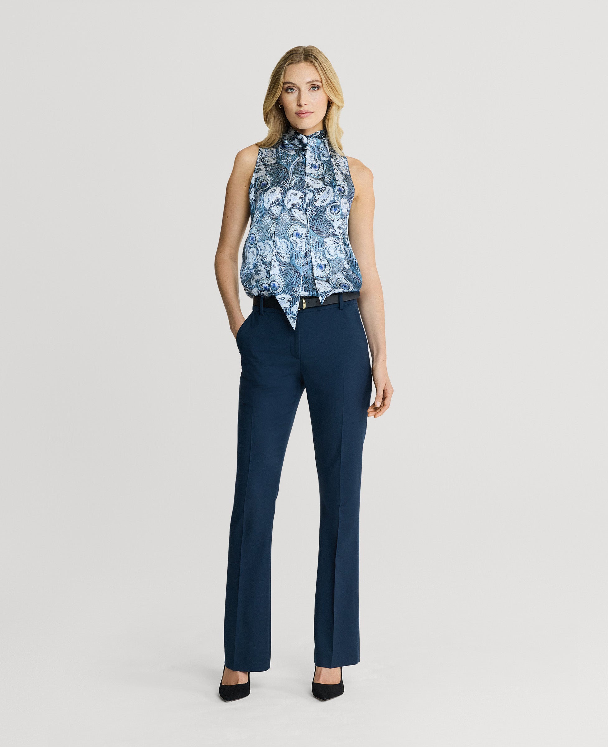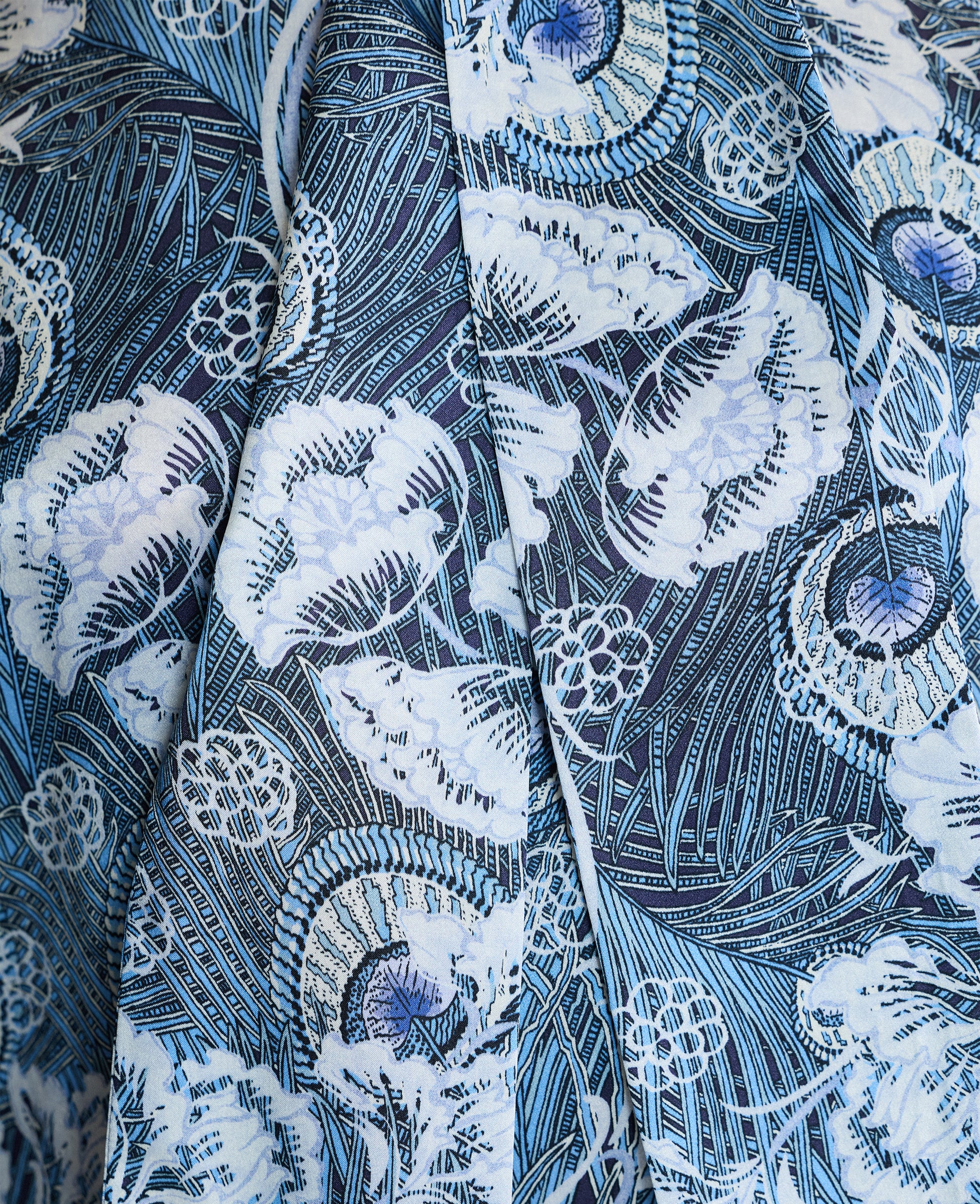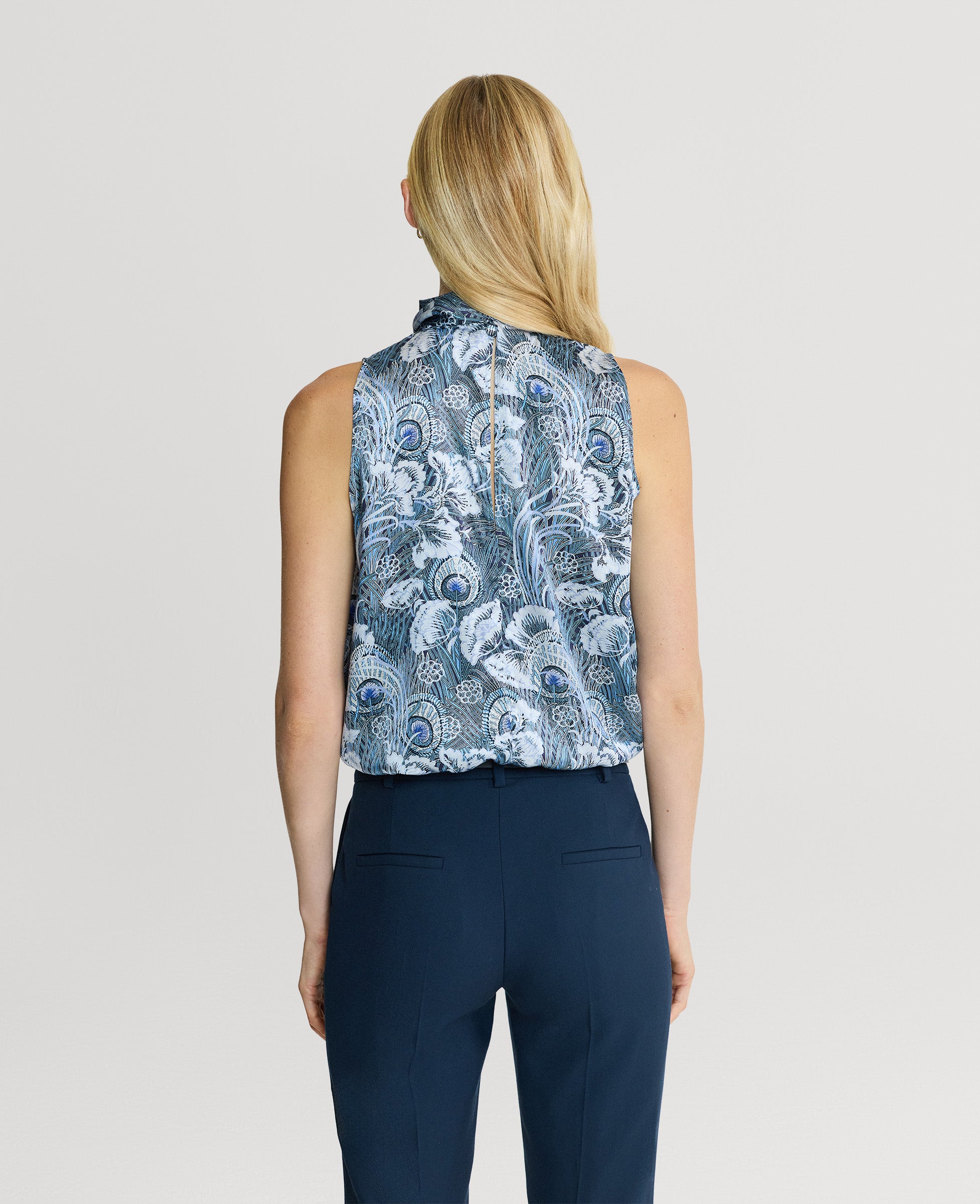 Our Peacock Silk Blouse is made from 100% fine silk, designed in a striking ice blue and white print from the Liberty archive. Elevated with a tie-neck detail, this blouse can be worn for day through to evening. Layer with formal tailoring or dress down with denim.