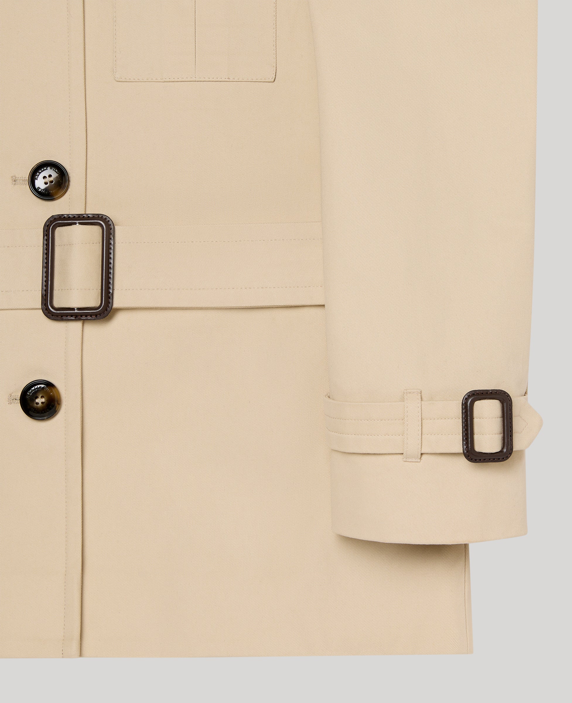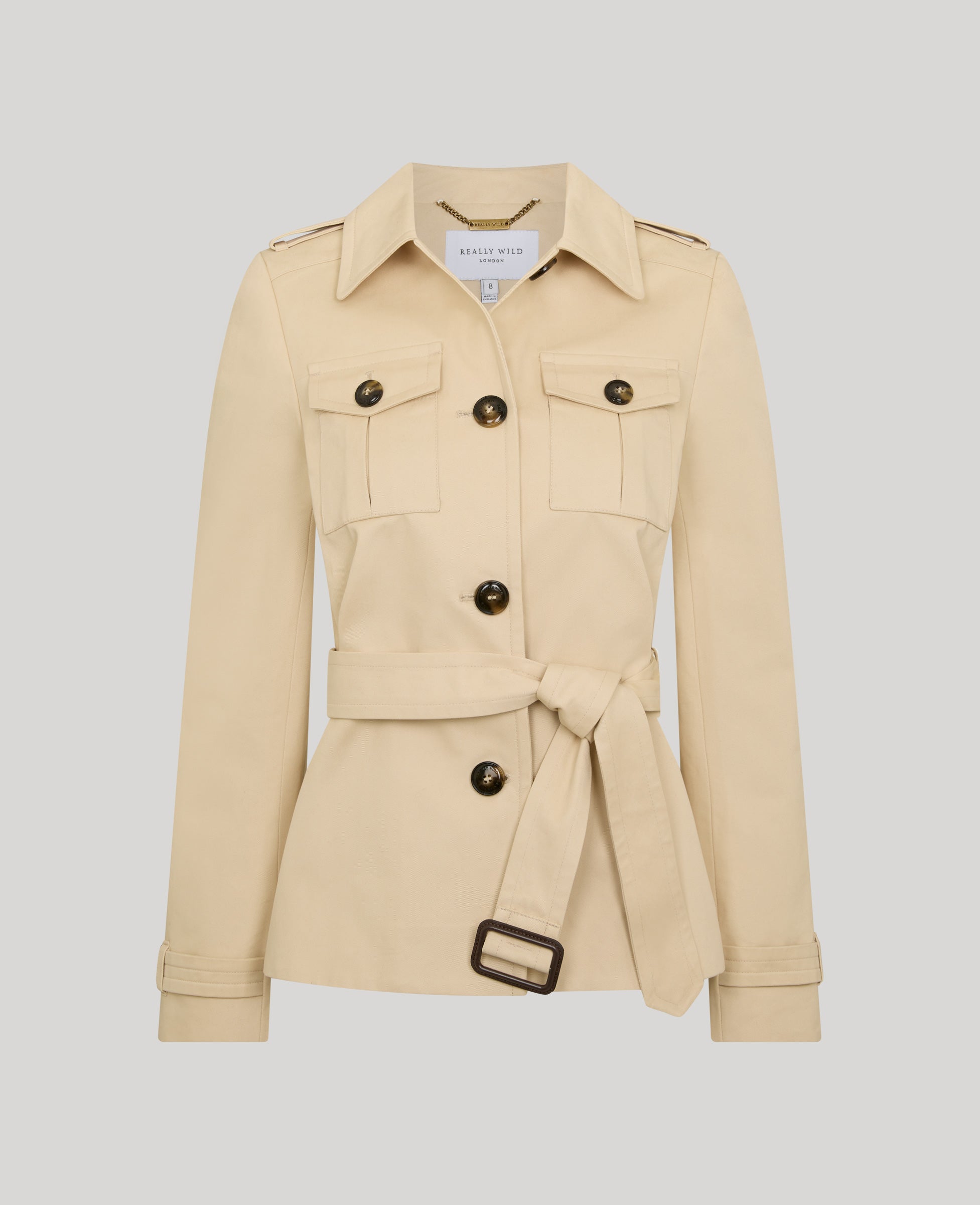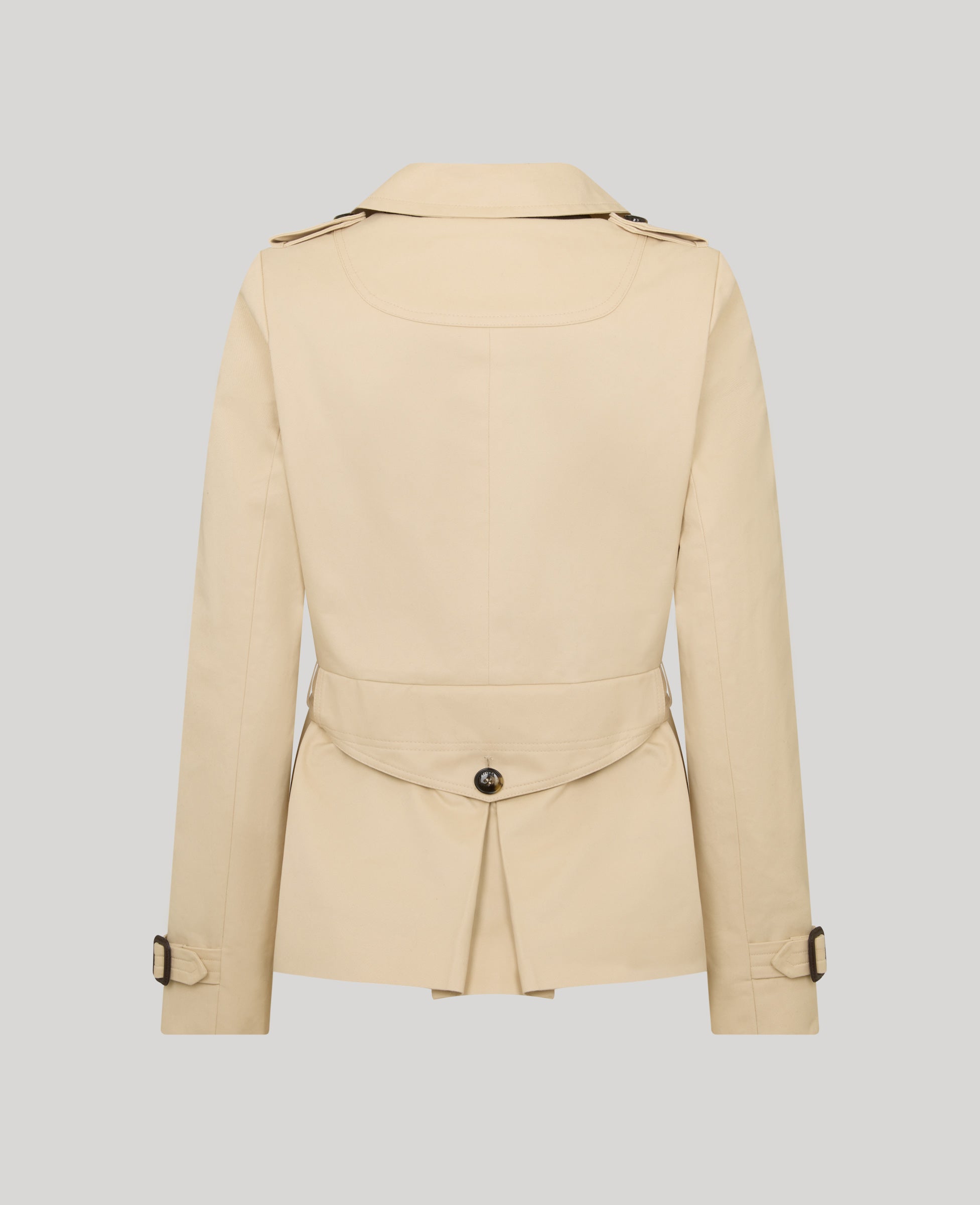 Cut to a flattering short length, this tailored trench features structured shoulders, utility-inspired pocket detailing and a defined belted waist to enhance the feminine silhouette. The soft cream tone ensures seasonless appeal, pairing beautifully with tailoring, denim or dresses for polished everyday styling.