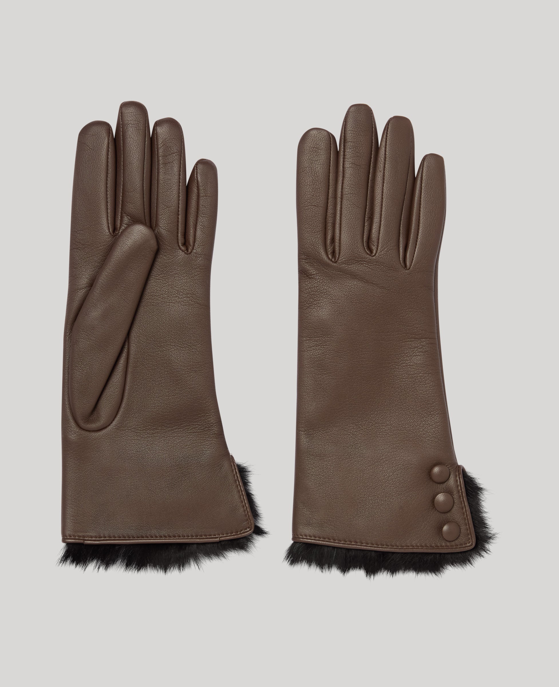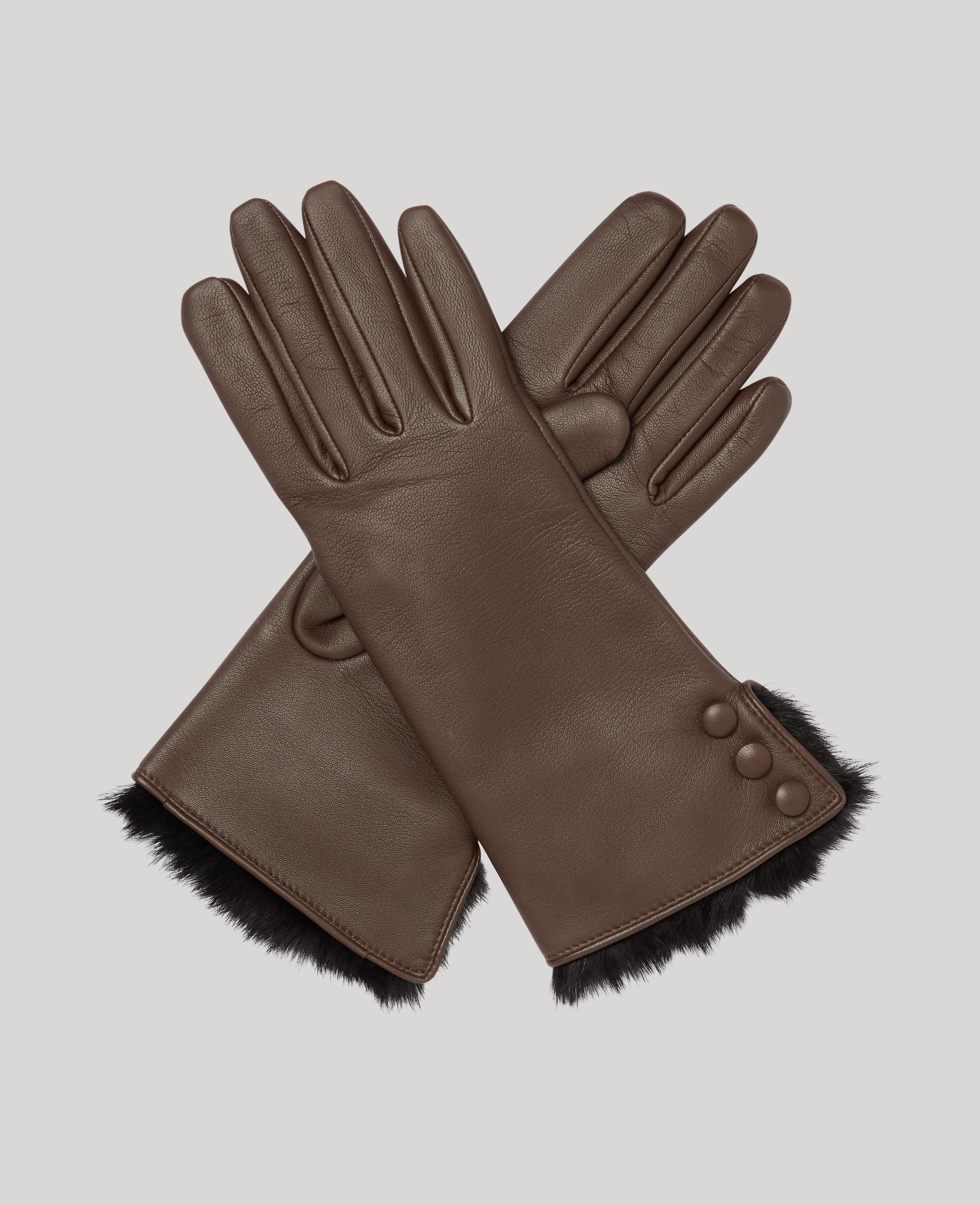 Crafted from beautifully soft leather and finished with luxurious rabbit fur cuffs, these gloves bring a refined touch to cold-weather dressing. A trio of covered buttons adds a subtle decorative detail at the wrist, while the smooth wool lining offers natural warmth and comfort. Tailored for an elegant fit that works for both smart and casual outerwear, they're timeless winter essential.