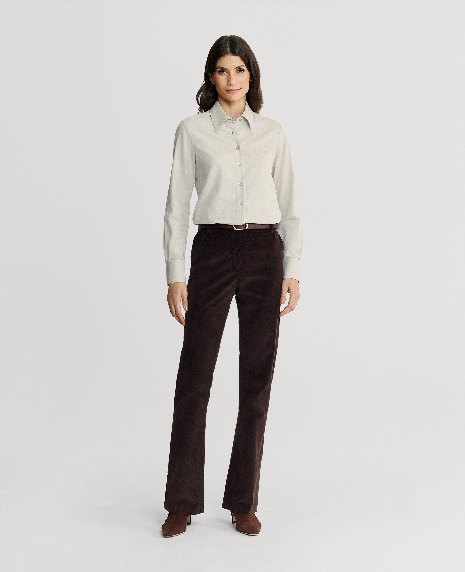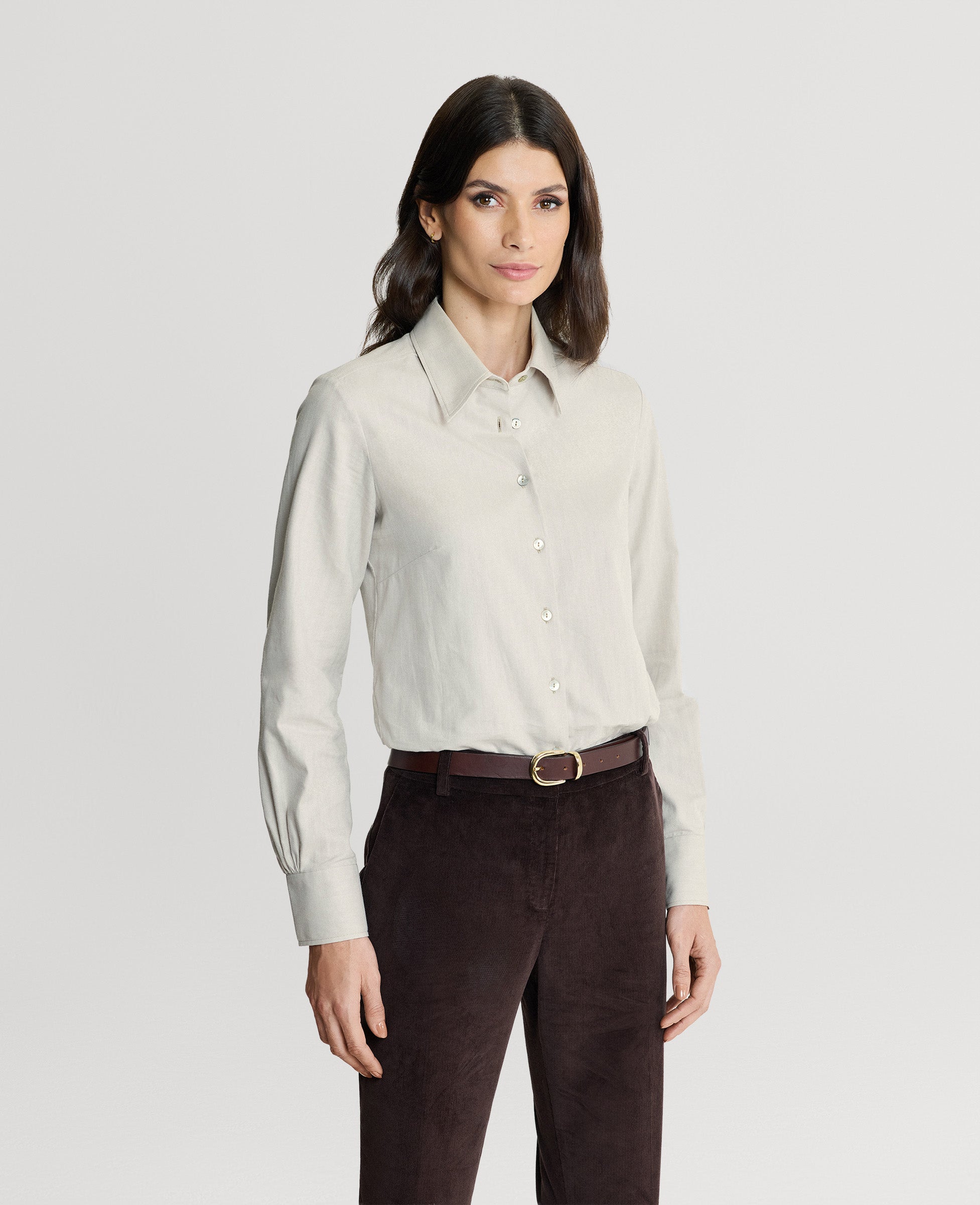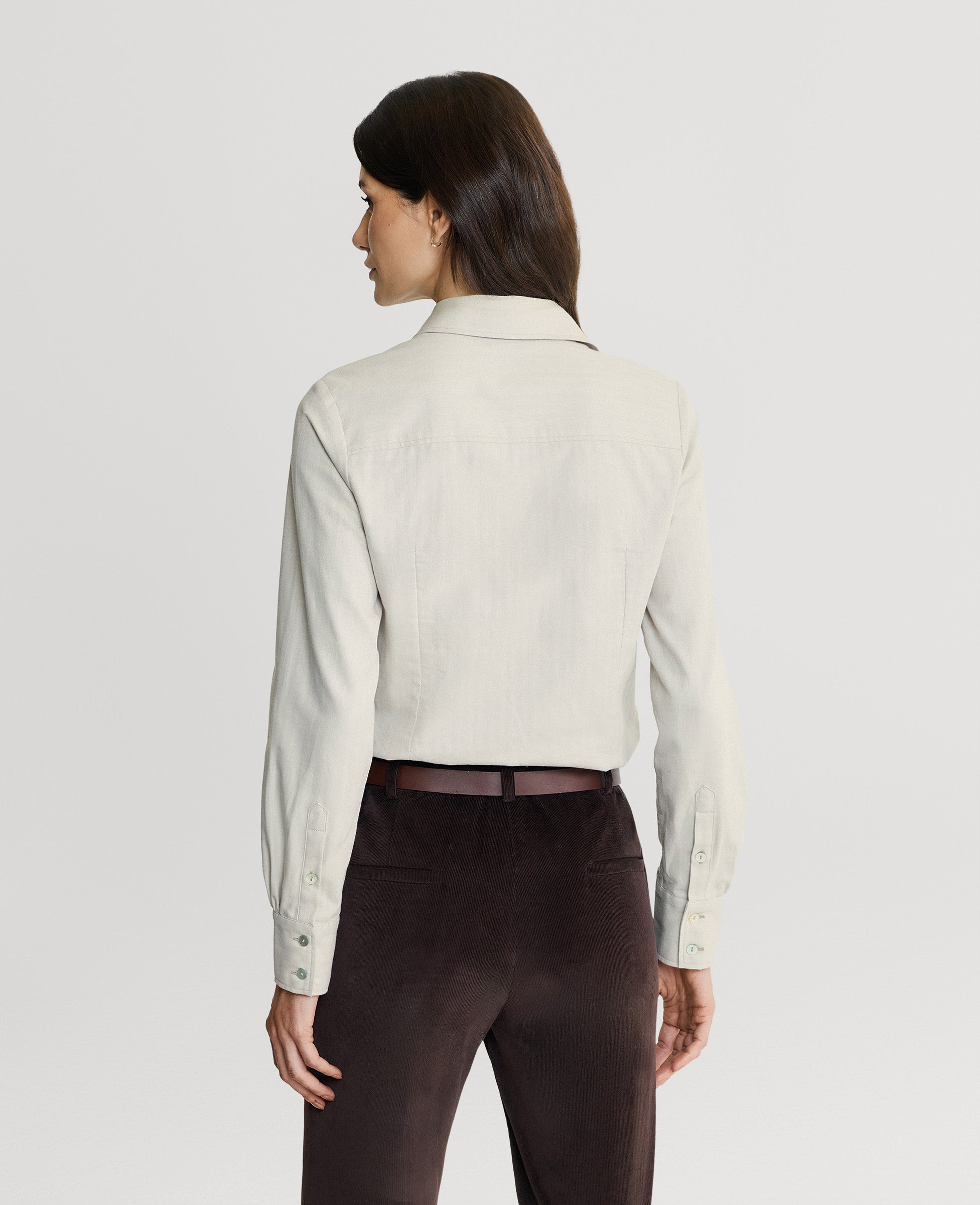 Made from 100% cotton, our herringbone fitted shirt has a warm handle and is designed to be luxurious and warm in the great outdoors. Tailored for a feminine silhouette, the Spencer Shirt is a versatile staple for any wardrobe. Features a classic collar, subtle RW embroidery on the collar stand, and mother-of-pearl buttons.