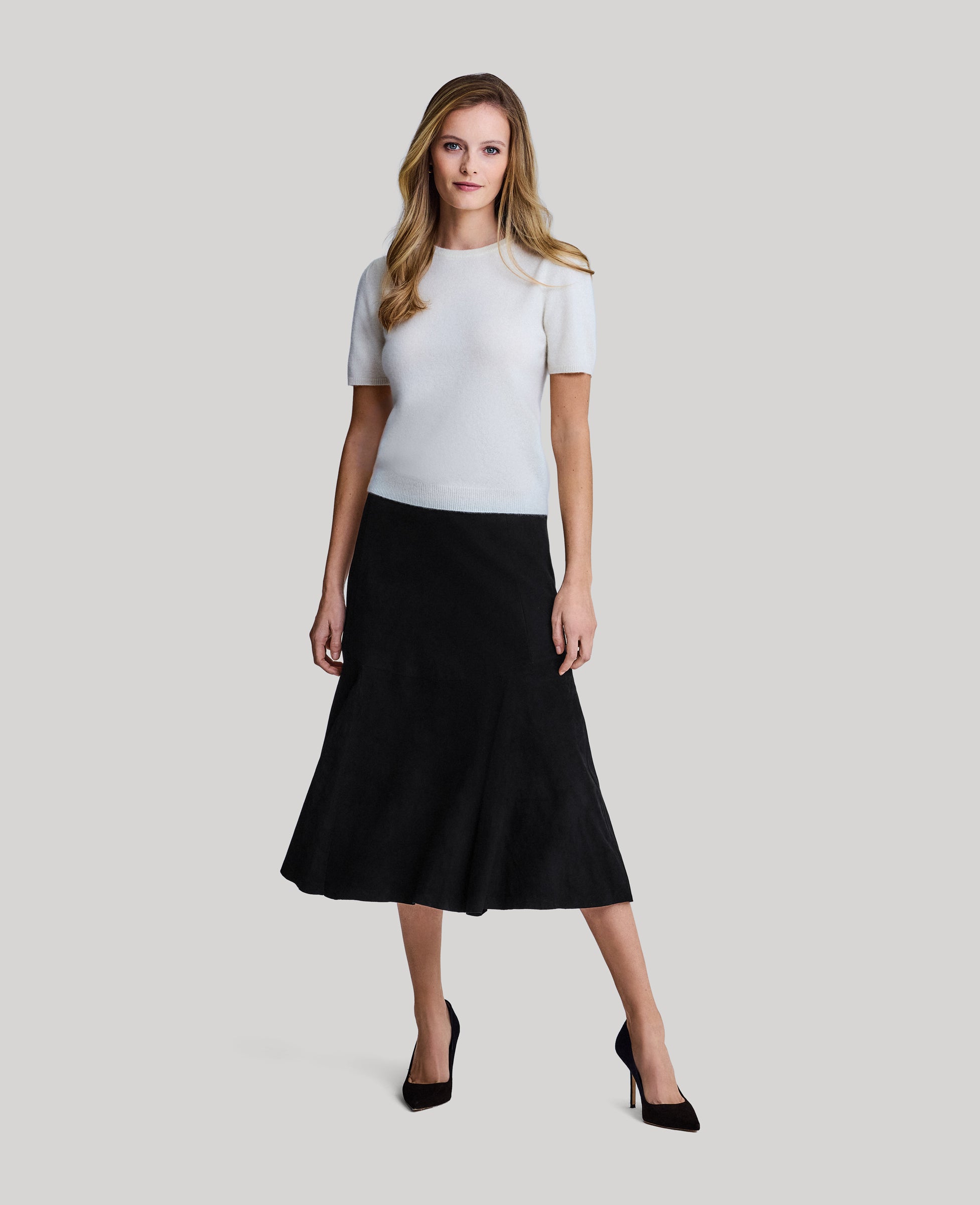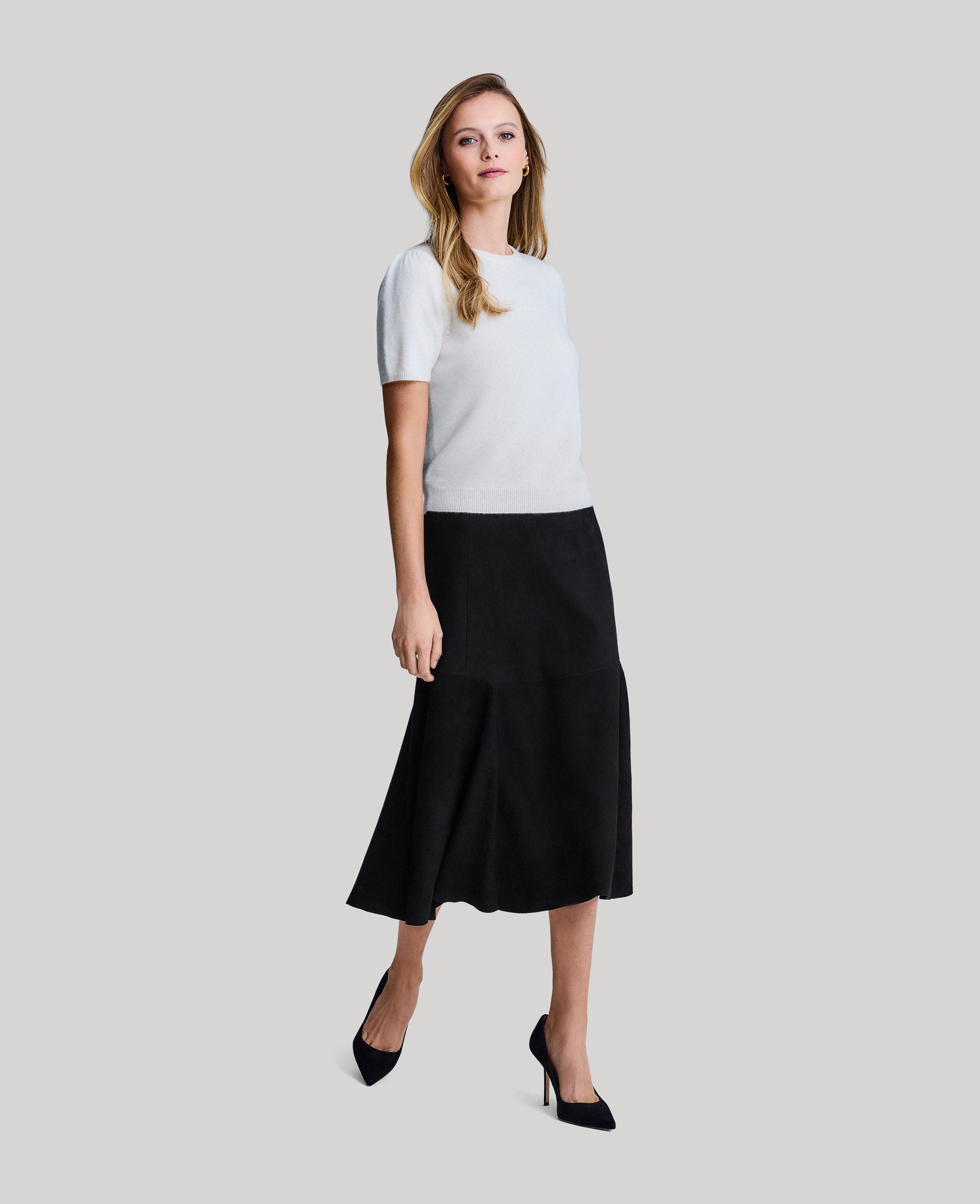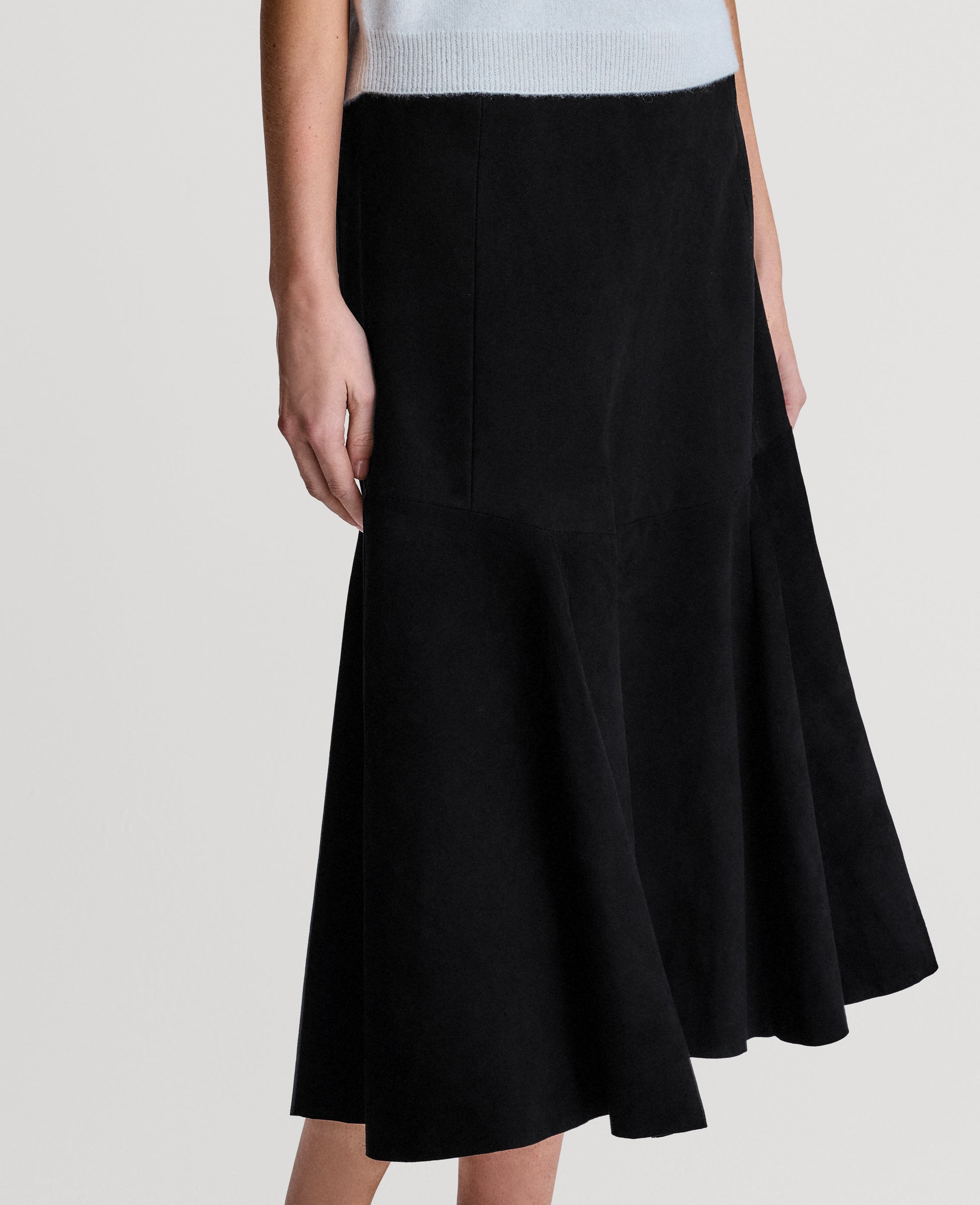 Made from 100% Suede, this Flippy Skirt is a classic-take on the seasonal staple. Coming in an elegant black, this skirt can be paired with simple silk blouse to create a sophisticated look.