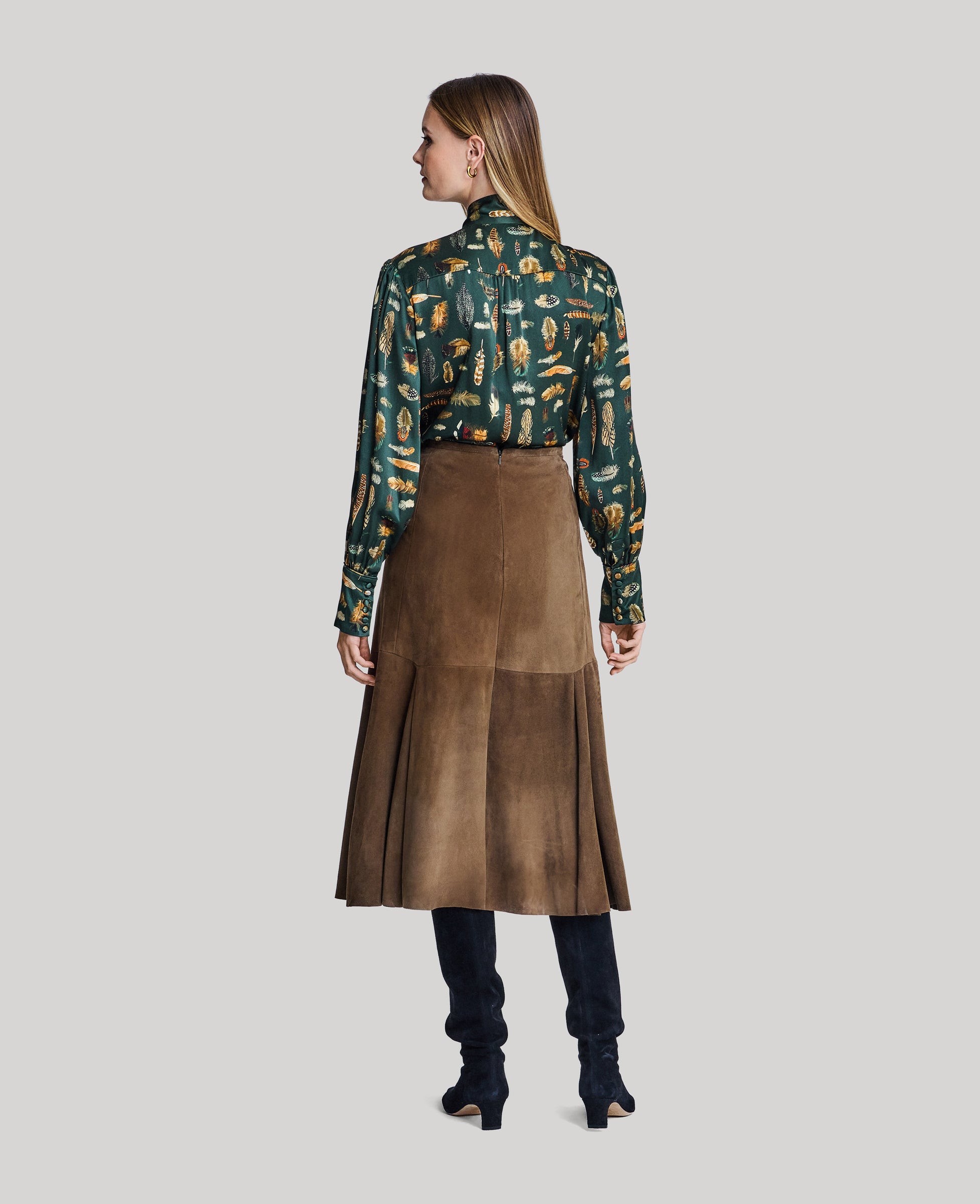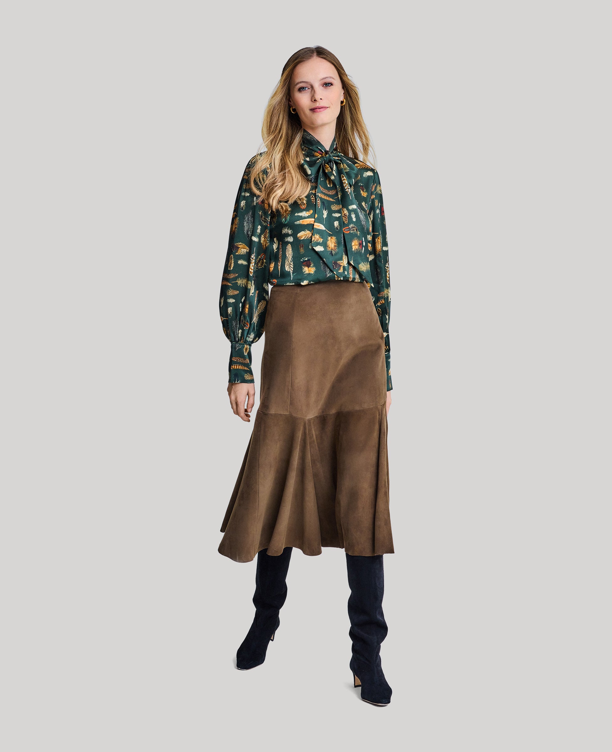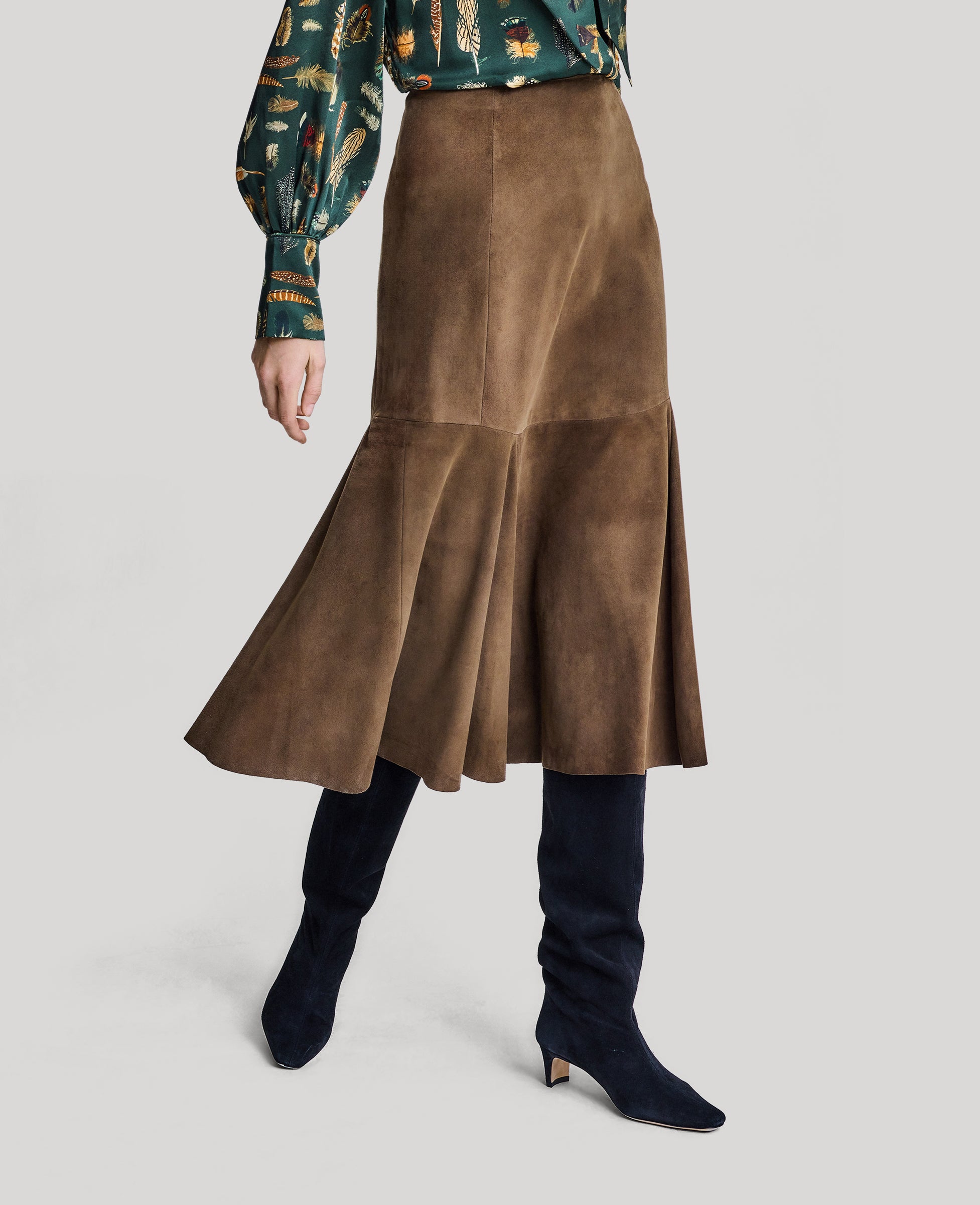 Made from 100% Suede, this Flippy Skirt is a classic-take on the seasonal staple. Coming in an elegant Khaki green, this skirt can be paired with simple silk blouse to create a sophisticated look.